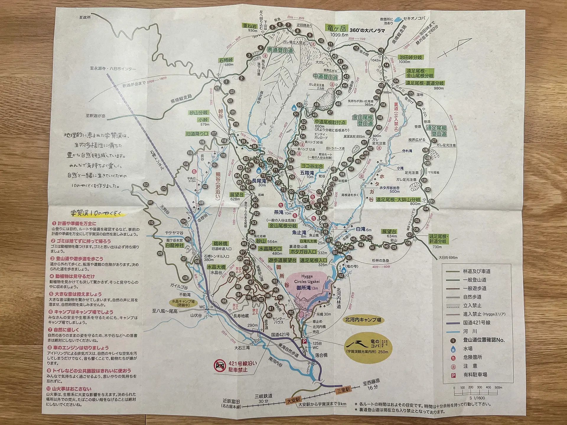 宇賀渓登山マップは景色の様子や危険箇所がイラストとともに載っていてわかりやすいです。YAMAPアプリなどの地図とともに併せて持っておくととても便利です。 宇賀渓登山マップは竜のコバのホームページでも確認できますよ!