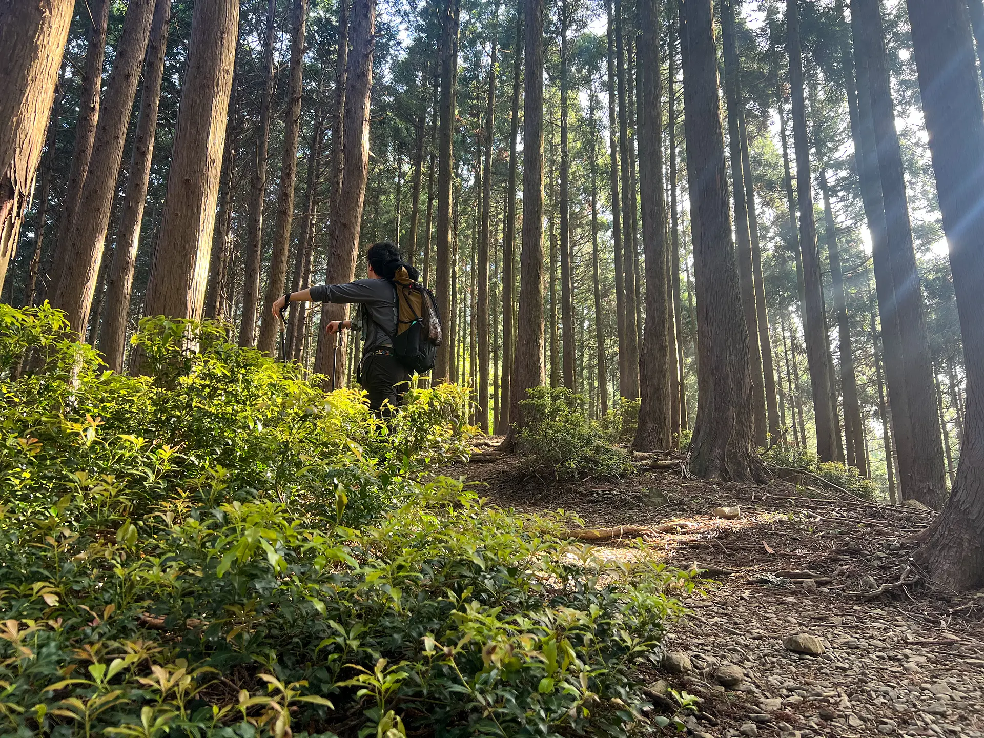 この日は、朝6:00から登山を開始し、1時間ほどで標高約600mまで登ってきました。ちょうど木と木の間から朝日が差し込み、とても幻想的な景色が見られました!