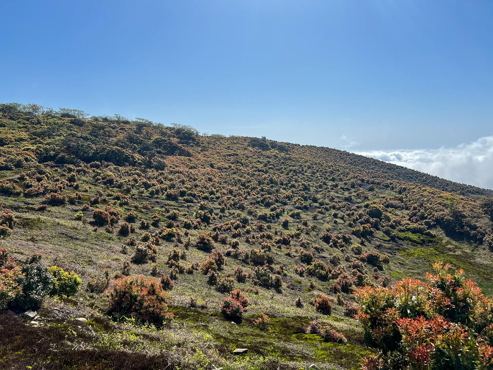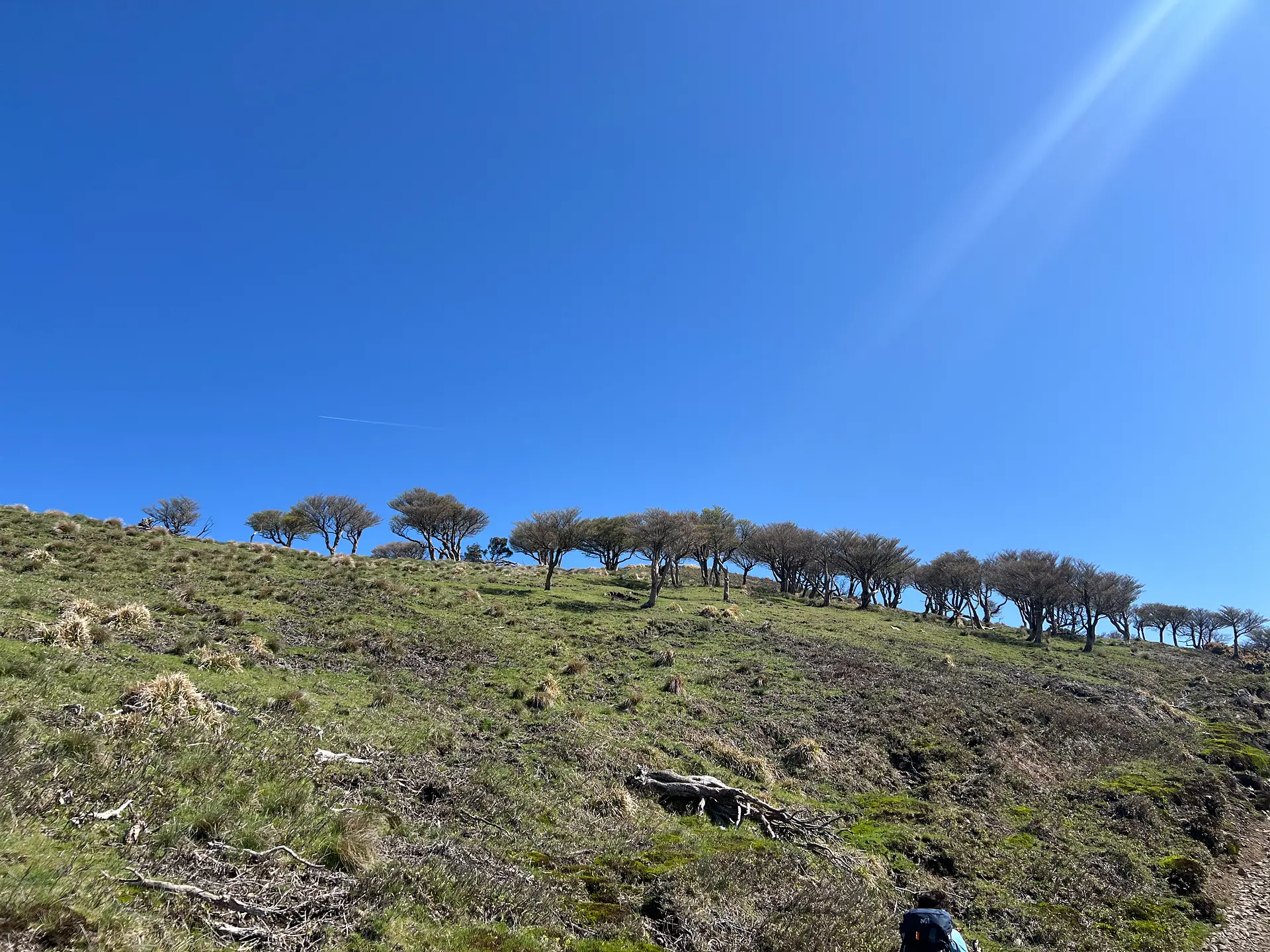 なだらかな稜線が見えてきたら、もうまもなく山頂です。傾斜はなだらかですが、徐々に風が強くなってくるので体のバランスに気をつけて、しっかりと歩きましょう。