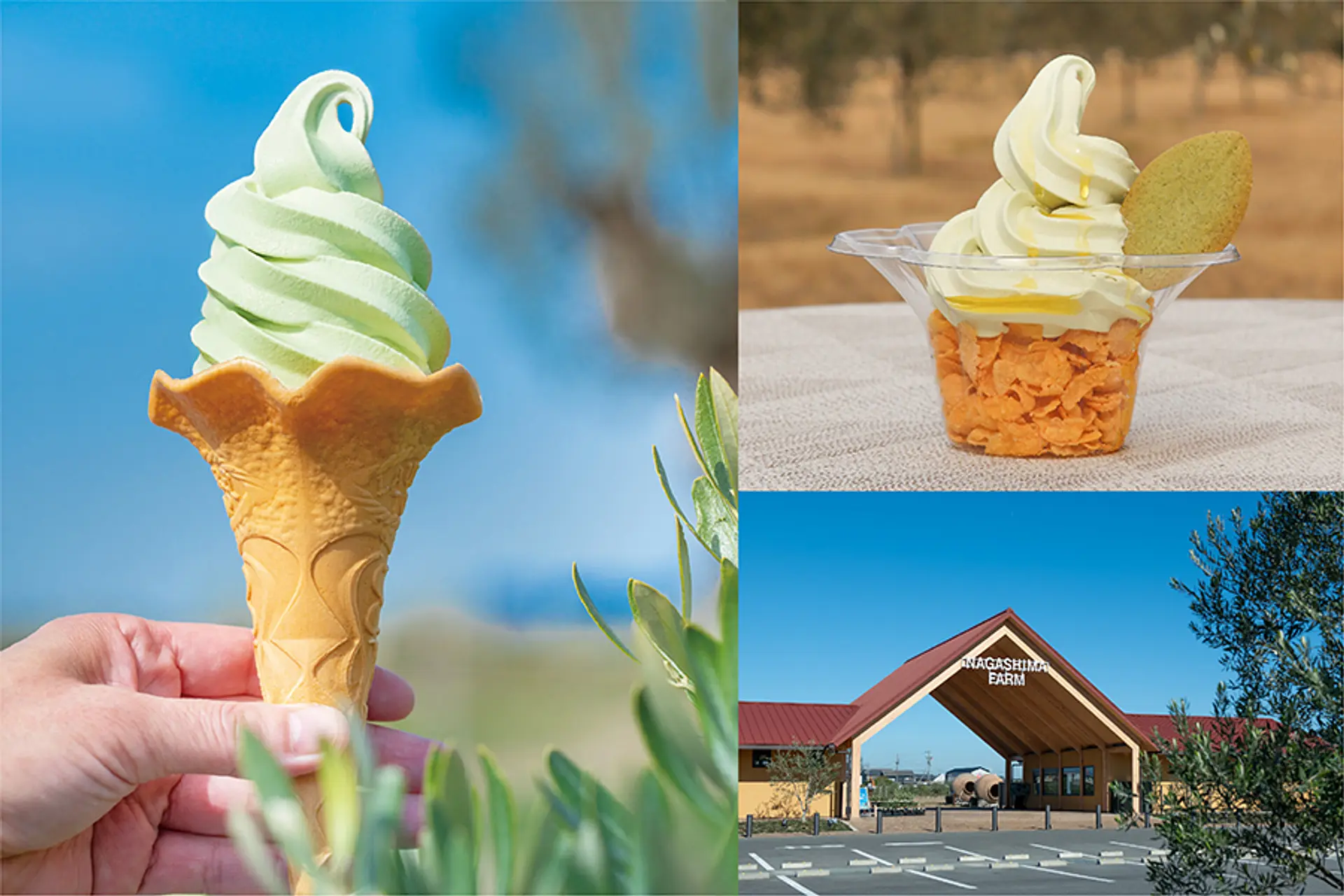 樹齢2000年という日本唯一のオリーブの大樹があり、オリーブ農園を備える「ナガシマファーム」。全国的にも珍しいオリーブ味のソフトクリームには、オリーブの葉の粉末が入っており、オリーブの風味たっぷり。