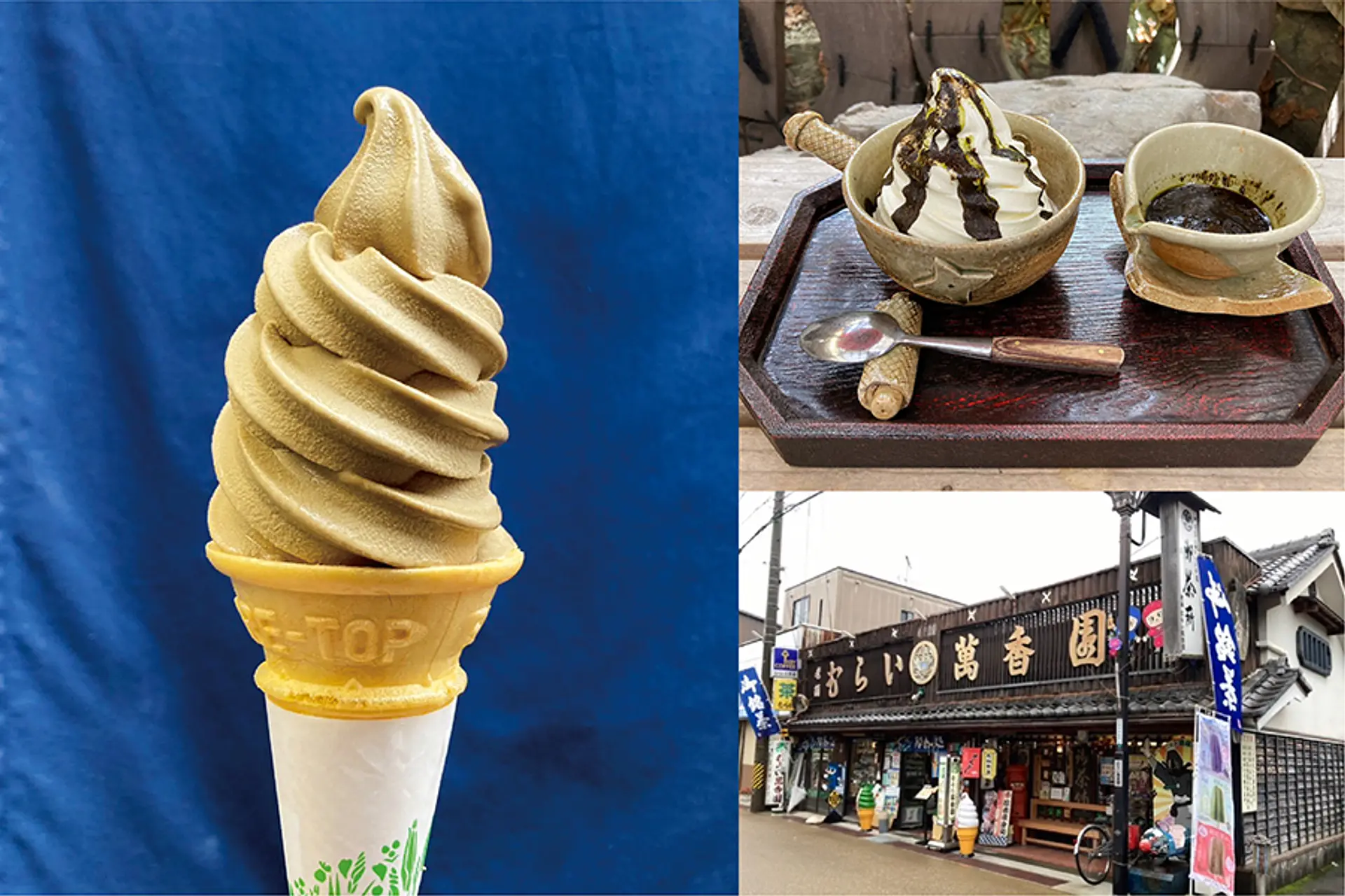 伊賀上野城の城下町にあるお茶屋さん。週末と祝日限定で販売される「ほうじ茶ソフトクリーム」は、香ばしいほうじ茶の風味豊か。抹茶ソフトとバニラソフトを使った「忍者パフェ」など喫茶メニューも揃っています。