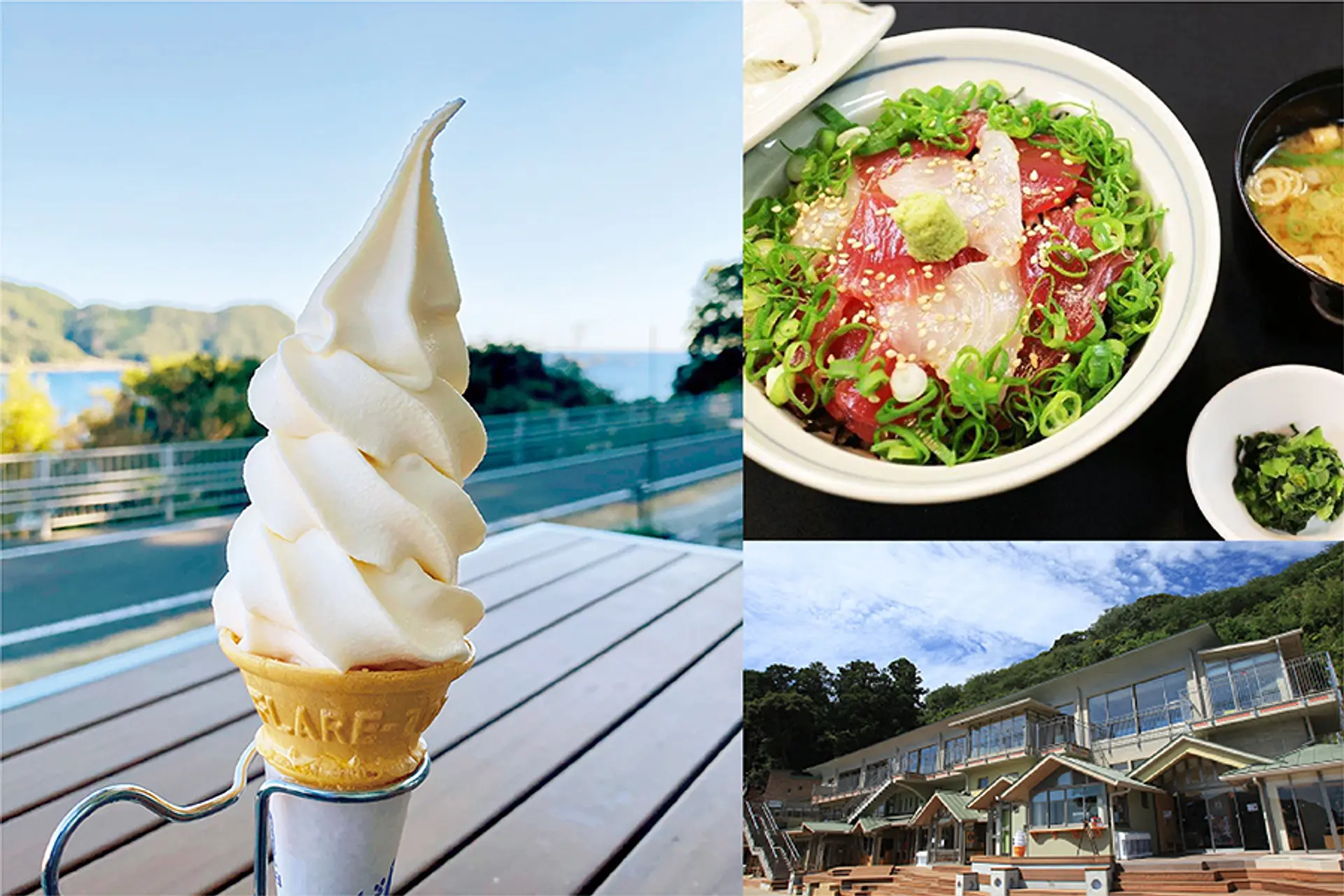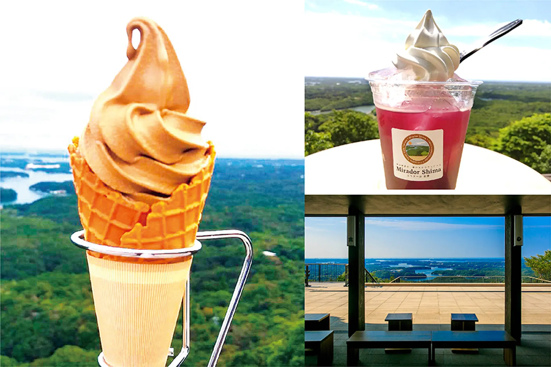 英虞湾のリアス海岸を眺めながらソフトクリームが楽しめる絶景のカフェテラスです。旬の伊勢志摩の素材を取り入れたオリジナル商品「志摩ソフトクリーム」が人気です。