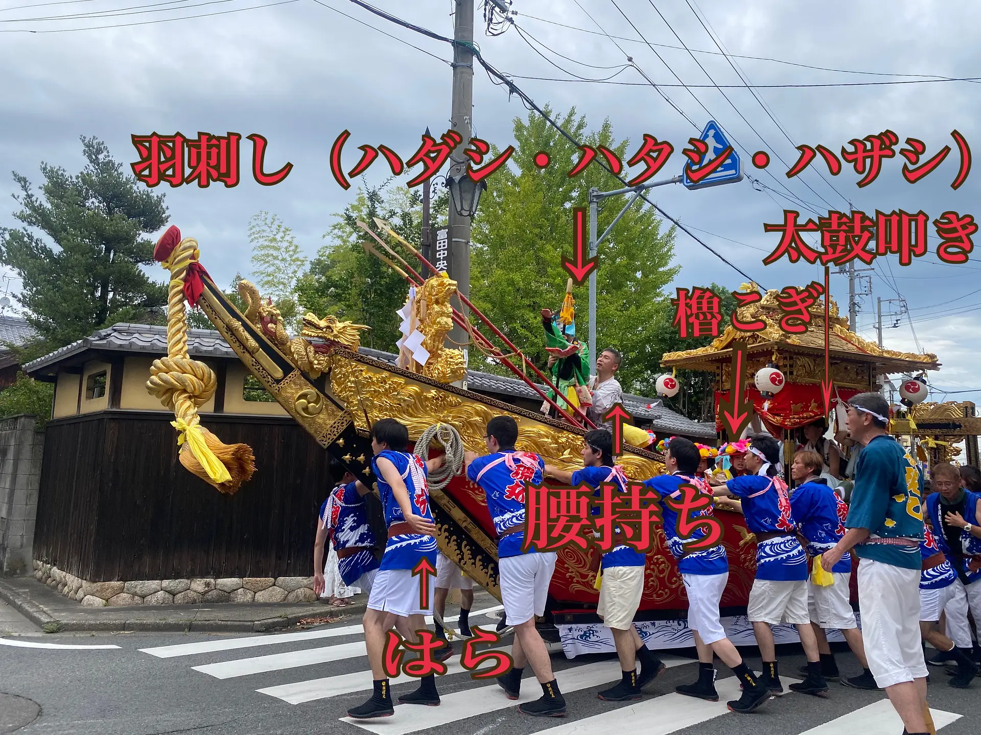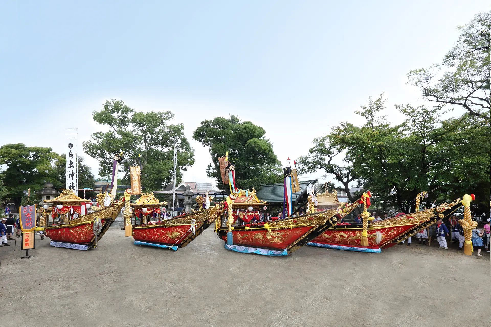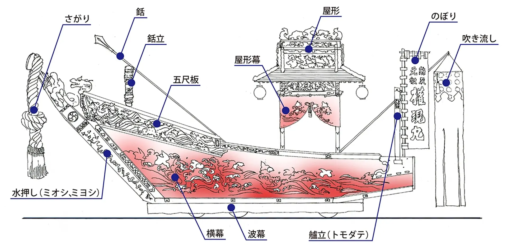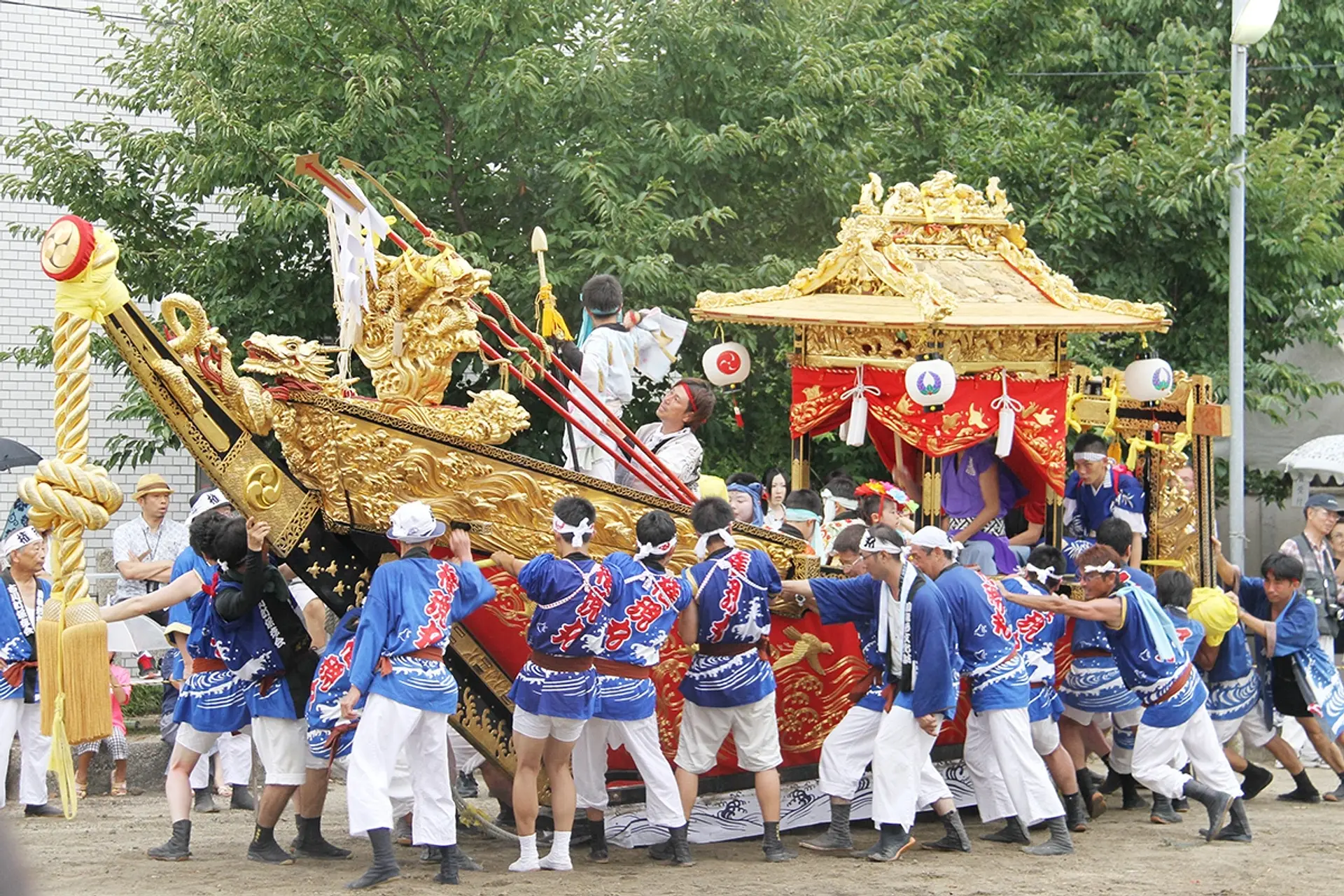 山車には屋形が載り、絢爛豪華な彫刻が施され、緋羅紗(ひらしゃ)に金糸等で見事な刺繍で彩られる横幕、同じく金糸で構成された水押(みよ)さがり等、豪華な装飾が施されています。そのきらびやかな山車を勇壮に繰り動かし、船首には着飾った羽刺し(はざし)や櫓漕ぎ、屋形には太鼓叩きが乗り込んで、唄や太鼓に合わせて行事が進行します。