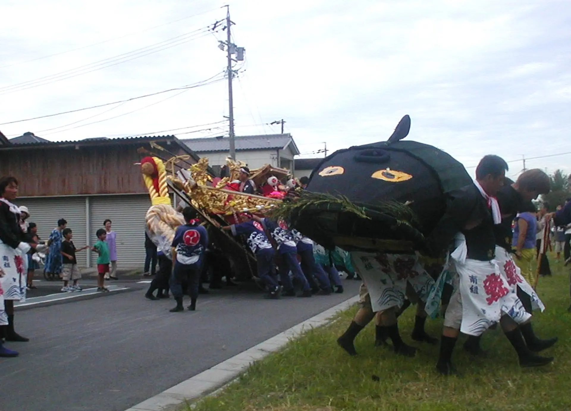 14日は各組が、町練りをします。国道1号や、各組の路地で演技を行います。狭い路地や民家の前を縫うように駆け抜ける鯨と、それを追う山車の演技は迫力満点。