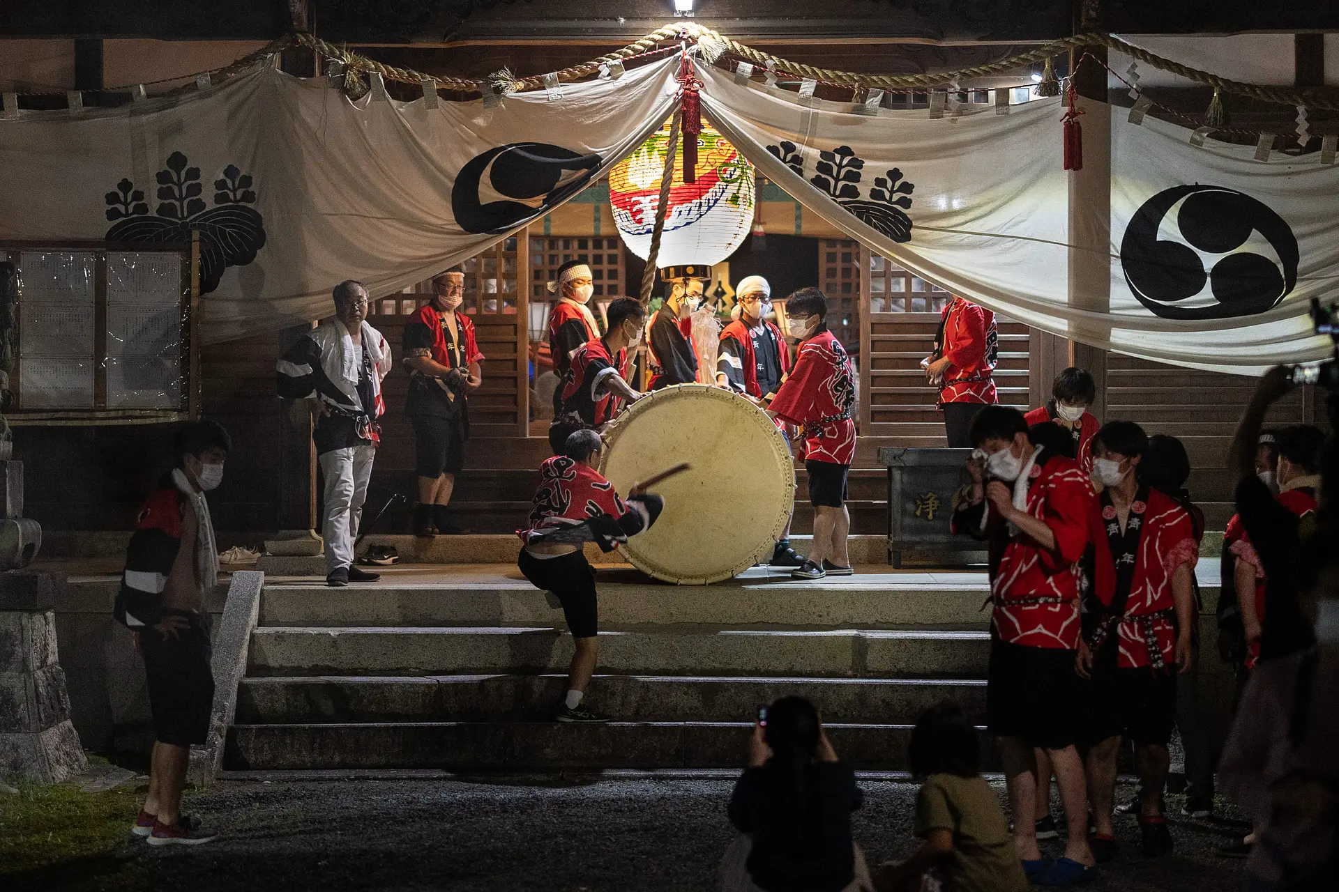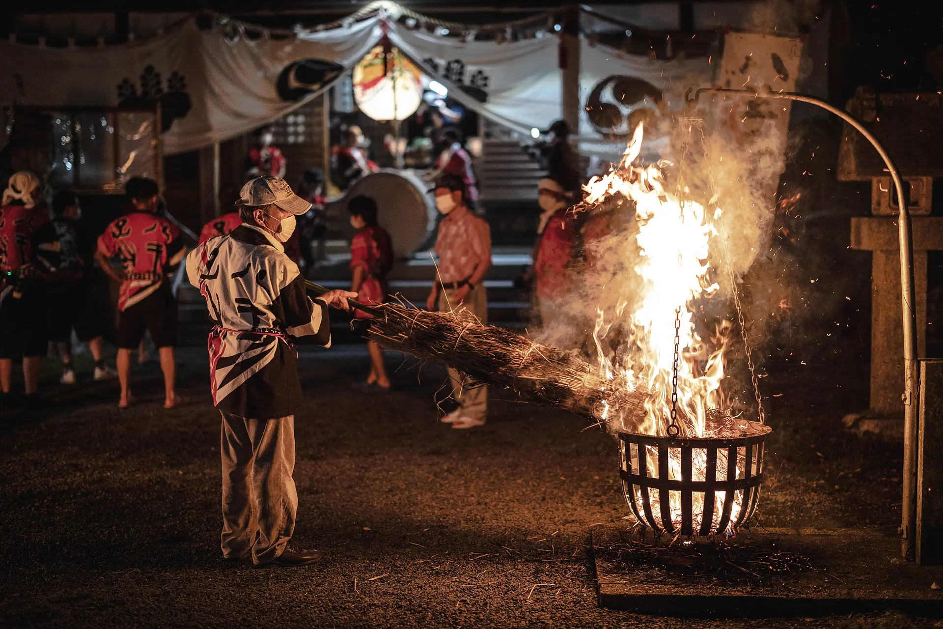 ※今年(2024年8月13日)の叩き合いは18時30分 太鼓奉納と青年壮年への宮司のお祓いが終わり次第行います。
