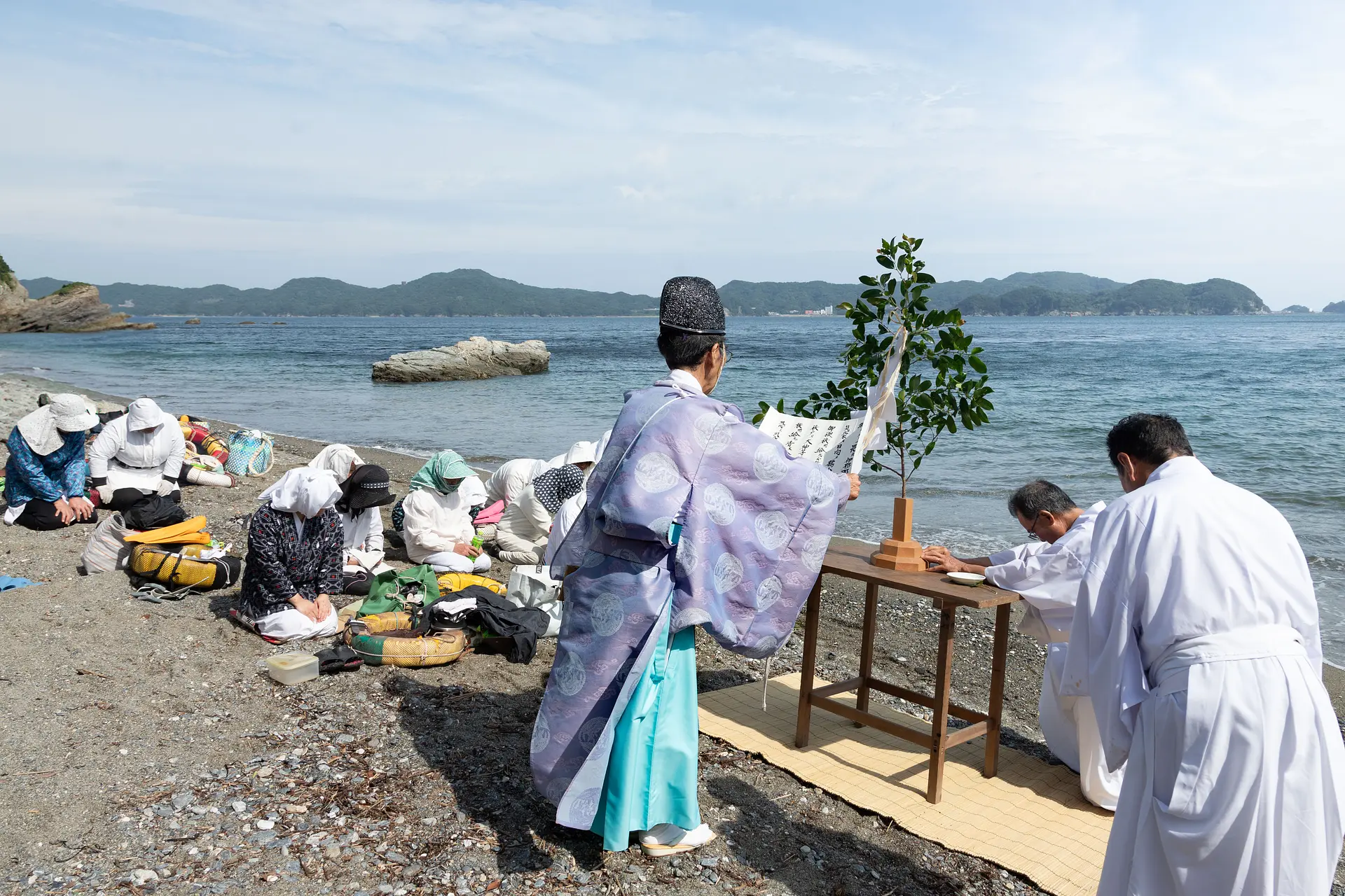 8:30頃にしろんご浜で宮司さんが安全操業を祈願し、その後 ホラ貝の合図で海女さんの操業がスタート!