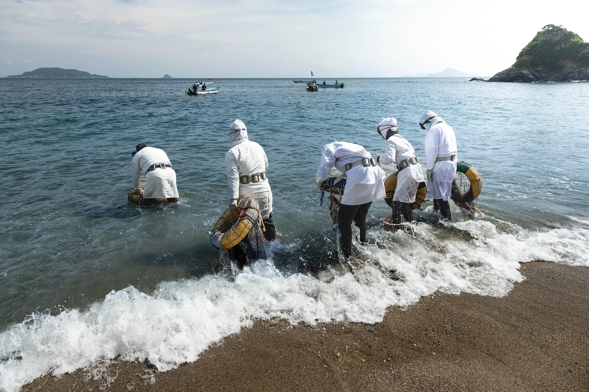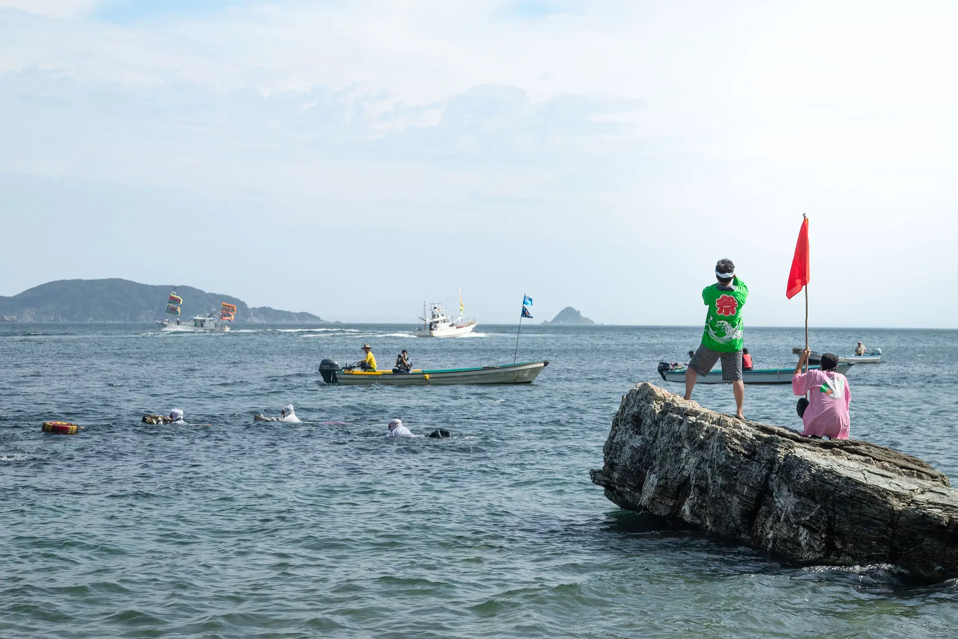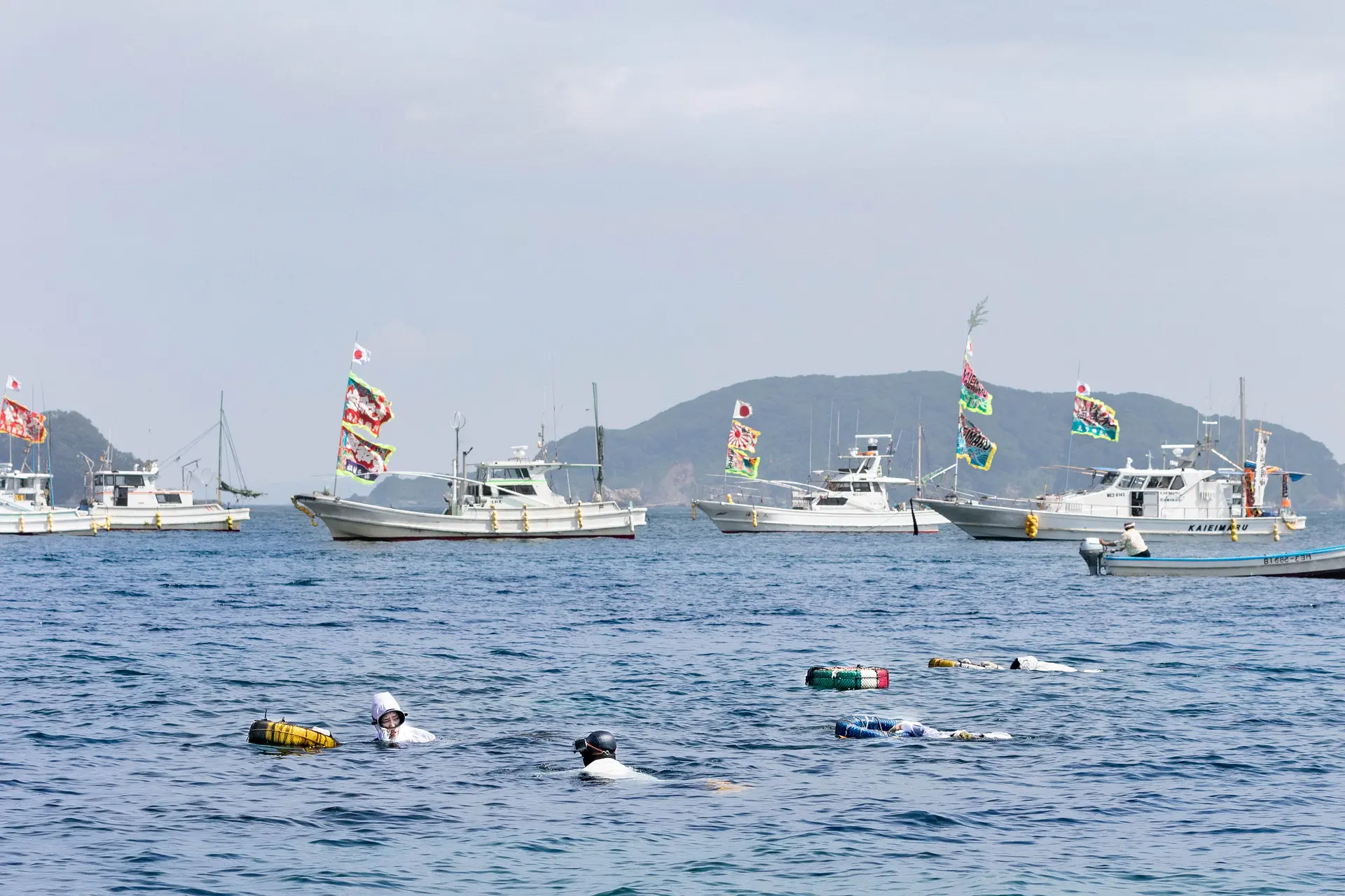 ・ホラ貝の合図で海女さんたちが一斉に操業を開始する瞬間