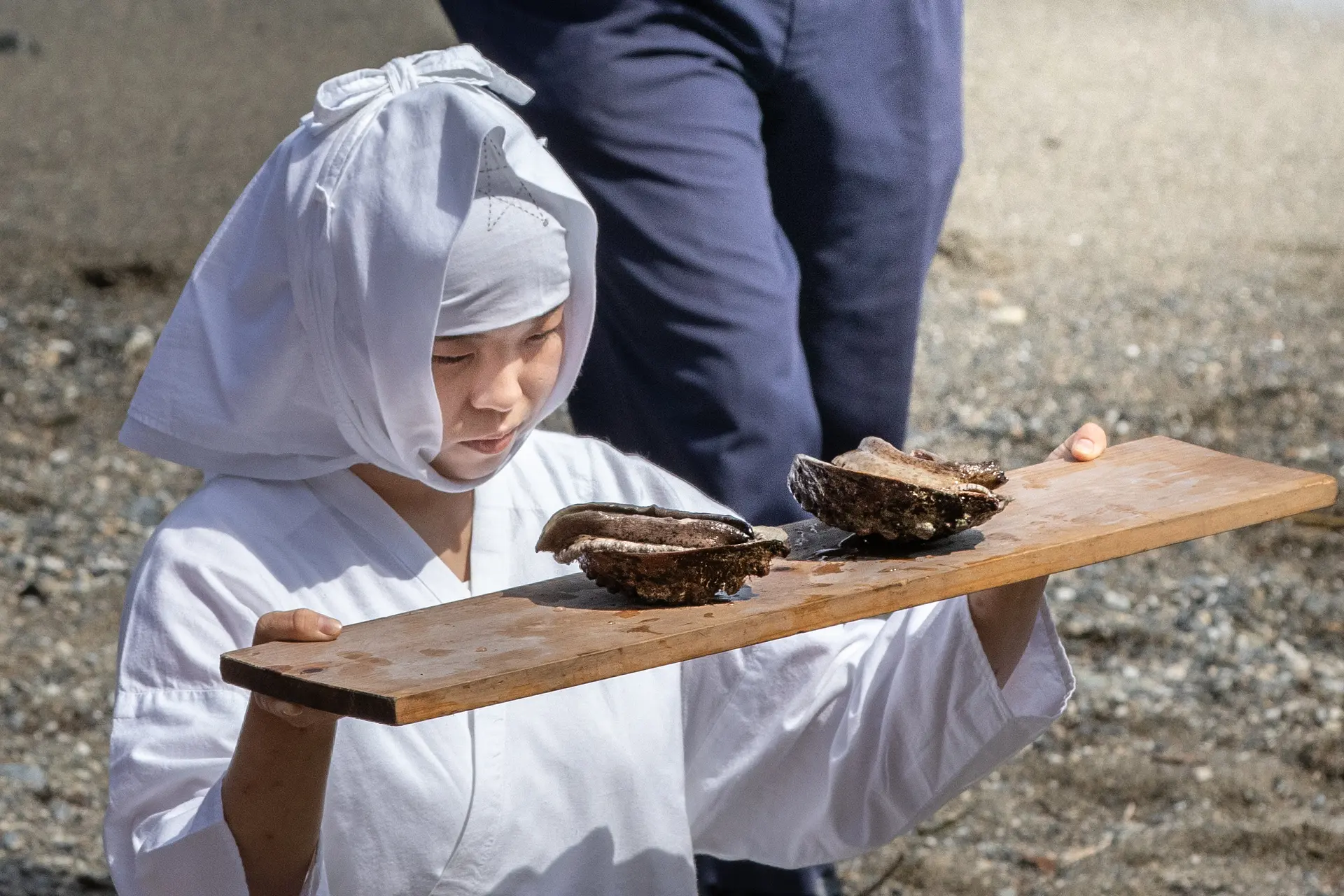 最初に採れた つがいあわびを「まねきあわび」として白髭神社に供え、大漁と海上安全を願って奉納します。