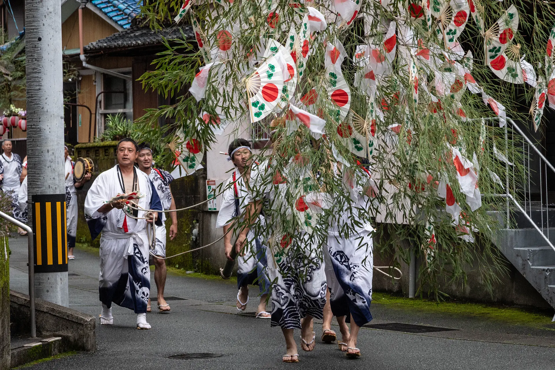 ・高さ約8~10mの大幣・小幣(おおへい・こへい)と呼ばれる竹飾りを絶対に倒さないように運びながら、町練りや本祭のクライマックスでもある登山をする姿!