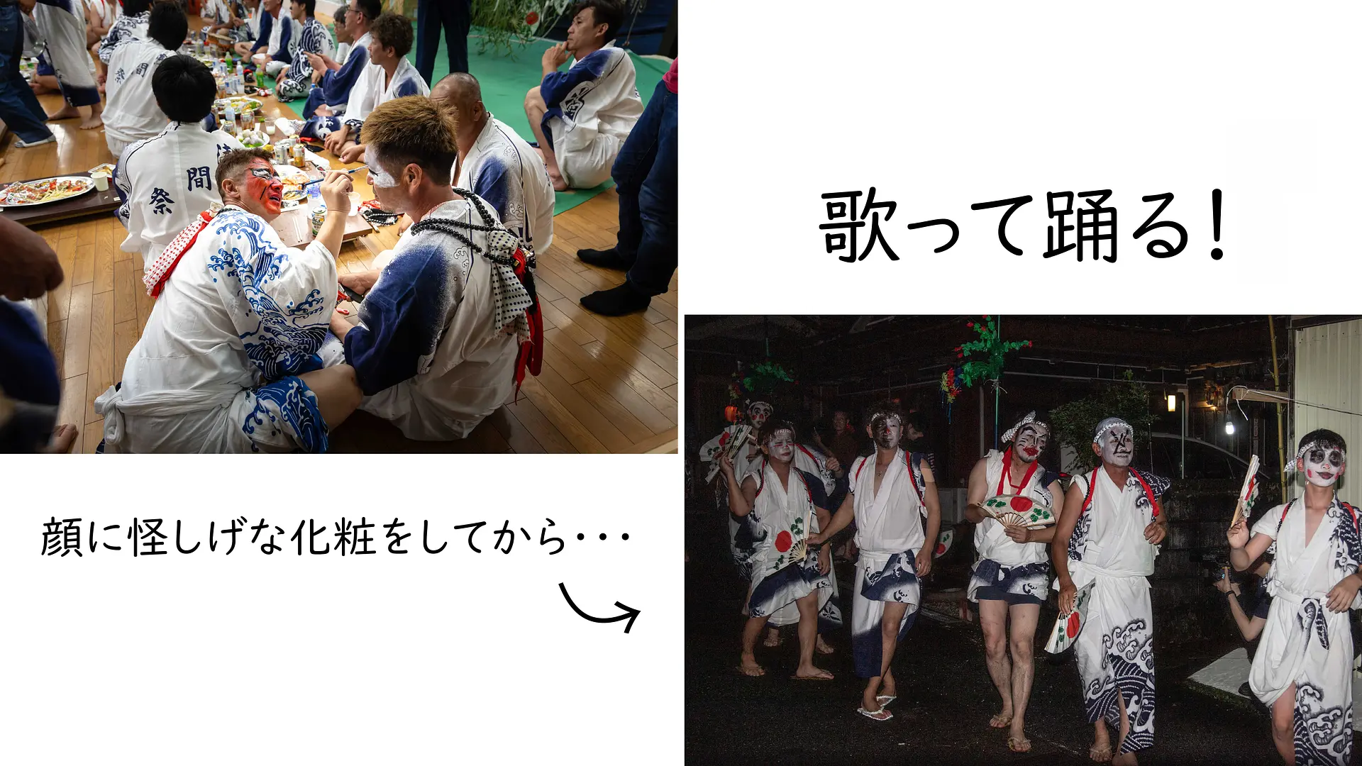 その後、祭り参加者が宴会の後 顔に化粧を施し防災センターから道中踊りの出発。魚市場で歌い踊った後、花火が打ち上げられ宵宮を終える。