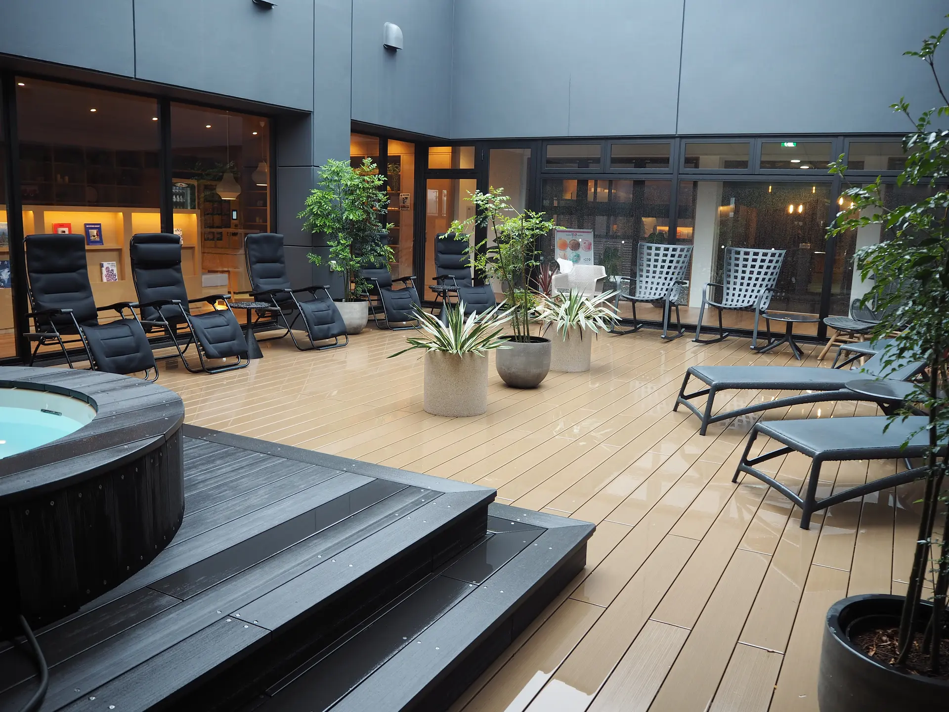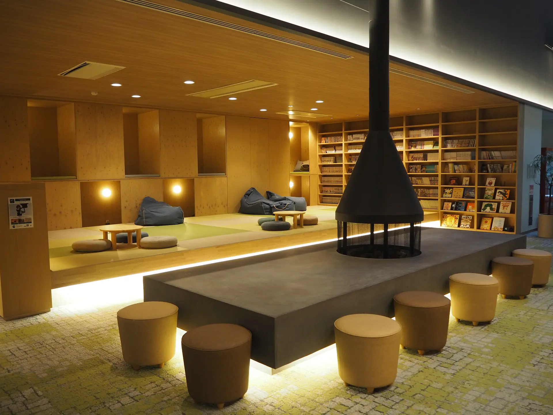 温泉ラウンジには、暖炉やいろんなタイプの休憩エリアがあります。