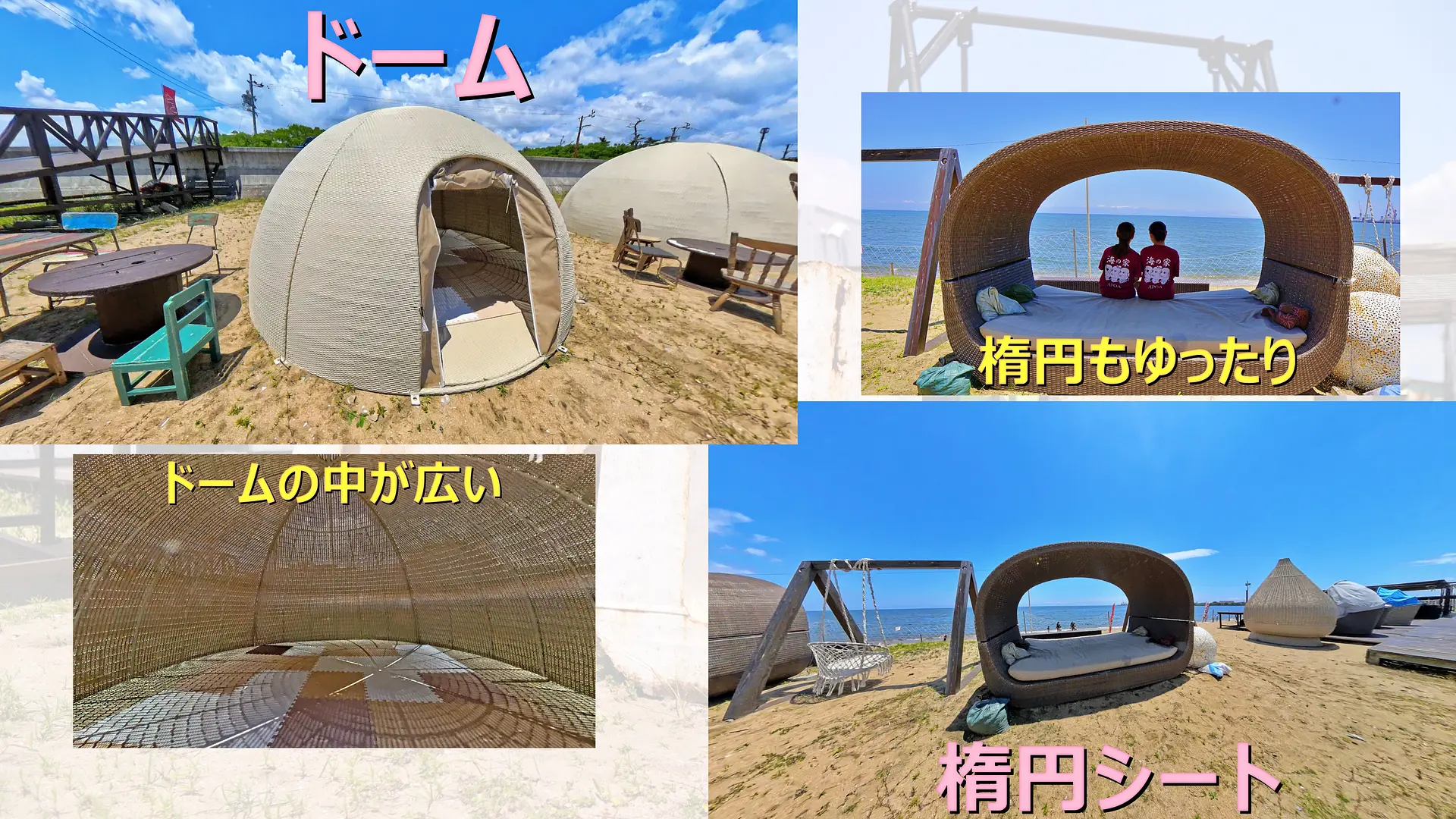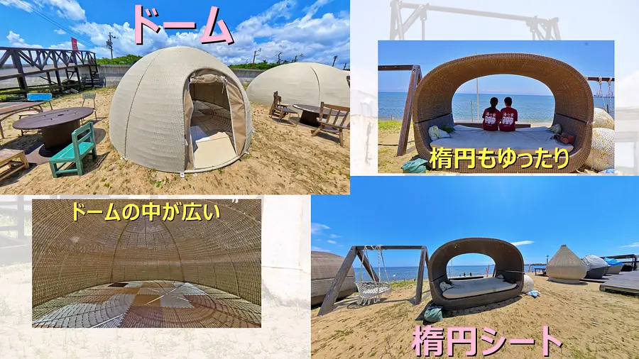 ドーム型シートと楕円シートの二つの有料シートがあり、こちらは日陰になり隙間から潮風がクーラーのように流れてくるので快適です。