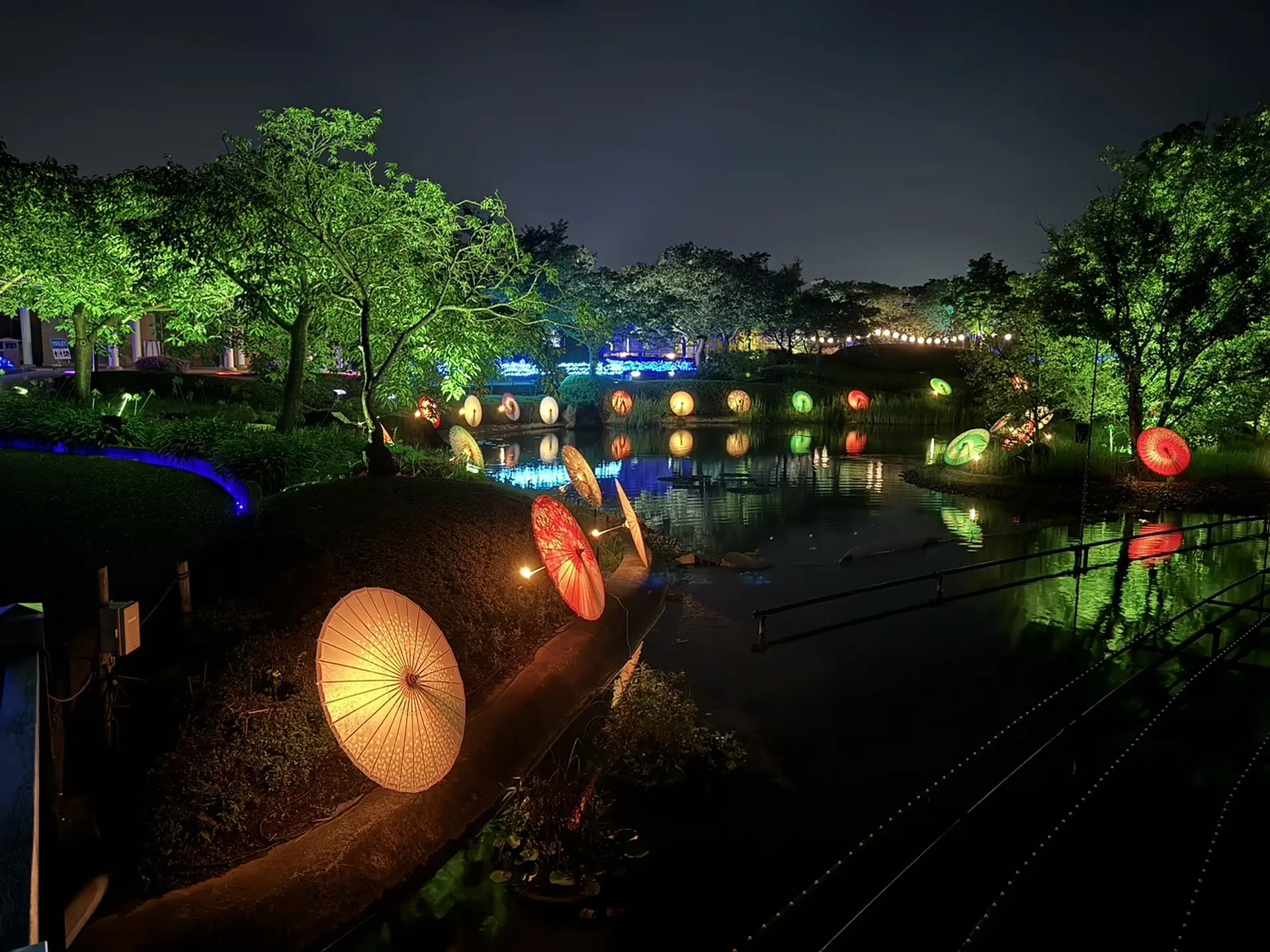 なばなの里中央の池を中心に、夜風に揺れる木々とともに幻想的な灯りで彩ります。 それに加え、天の川をイメージしたイルミネーションや和の雰囲気を感じさせる竹灯籠や鮮やかな和傘などがあり、涼しい夏の夜をゆっくりと楽しむことができます。今回はこの素晴らしい夏のイベント「里の夏あかり」の徹底リポートをお届けします。