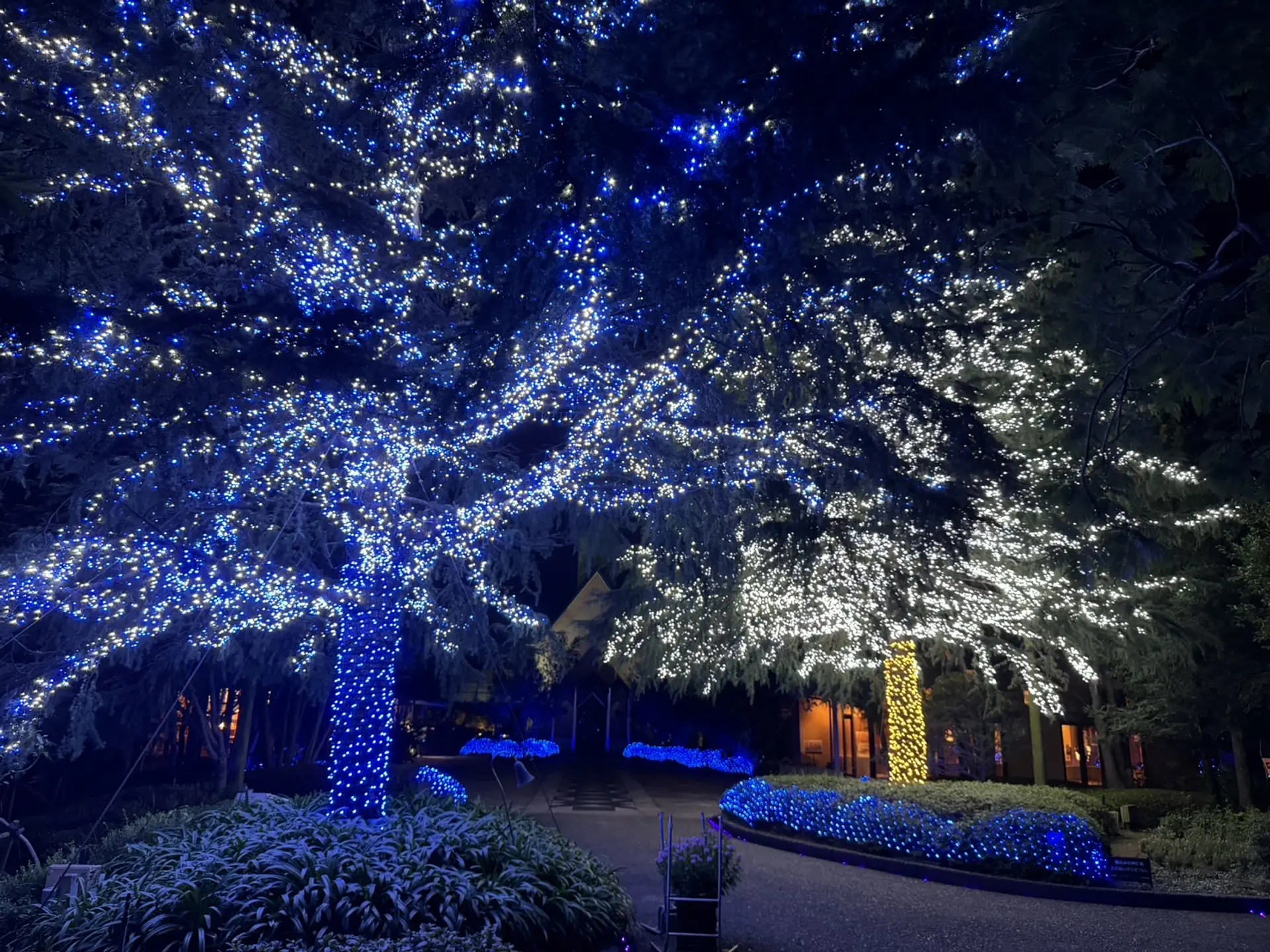 チャペル前にある高さ約20mもあるヒマラヤスギはクリスタルホワイトに彩られたゴージャスなツリーと、パステルブルーに彩られたツリー。写真スポットであり、カップルや家族で綺麗なツリーとお写真を撮ってみてください。