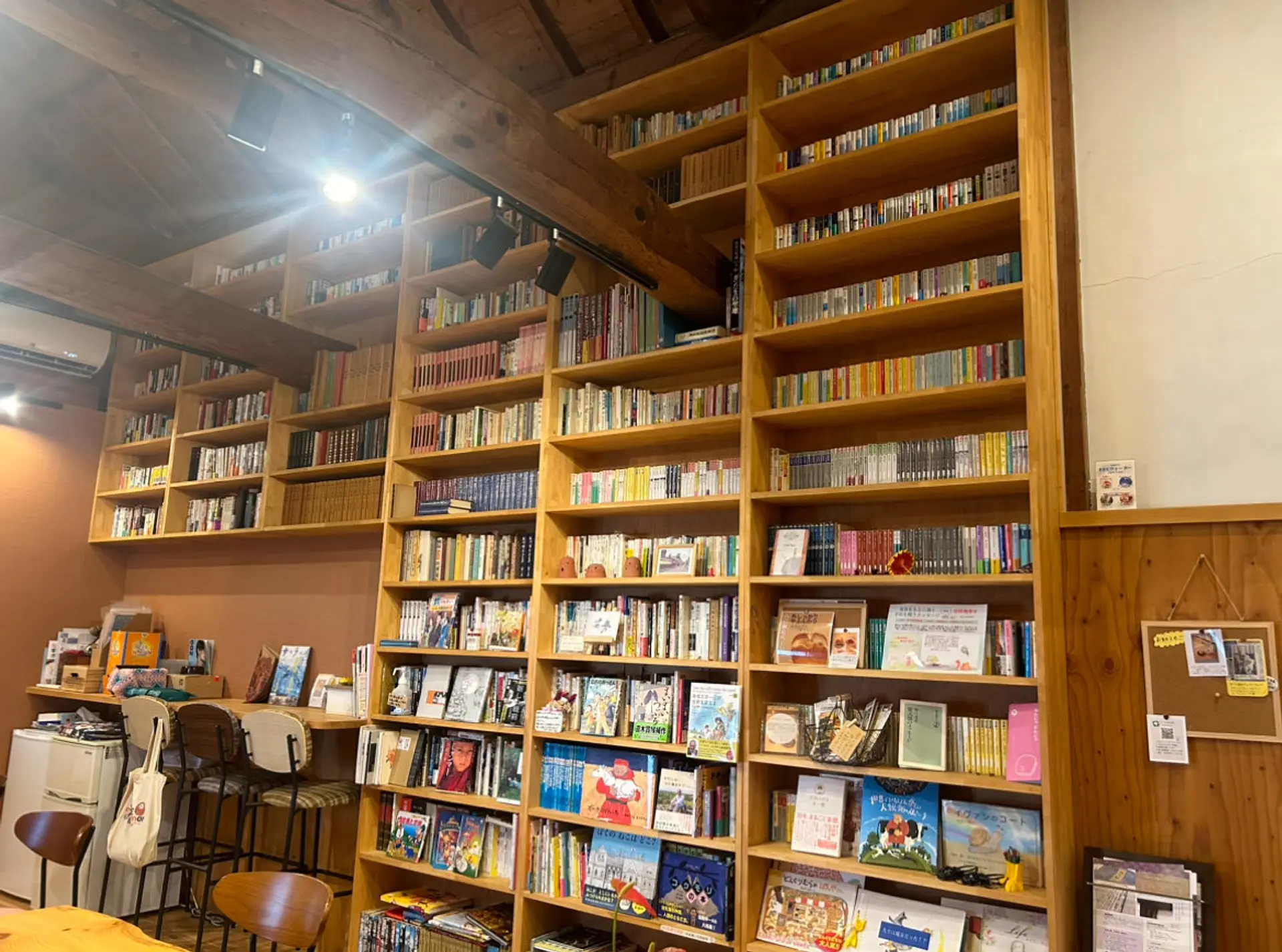 壁一面の本棚にも感激!ここの本は自由に読むことができるのだそう!