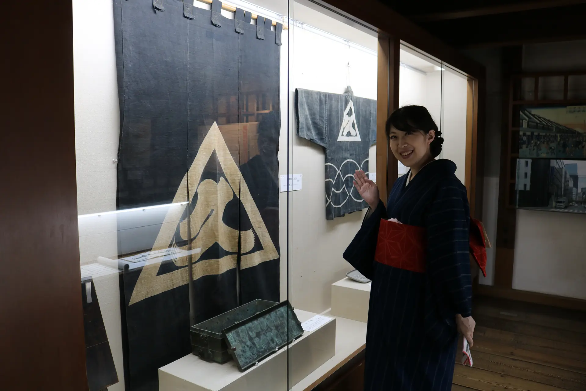 内蔵展示室には貴重な資料がたくさん。小津家の「久」という家印入りの暖簾もこちらで見ることができます。