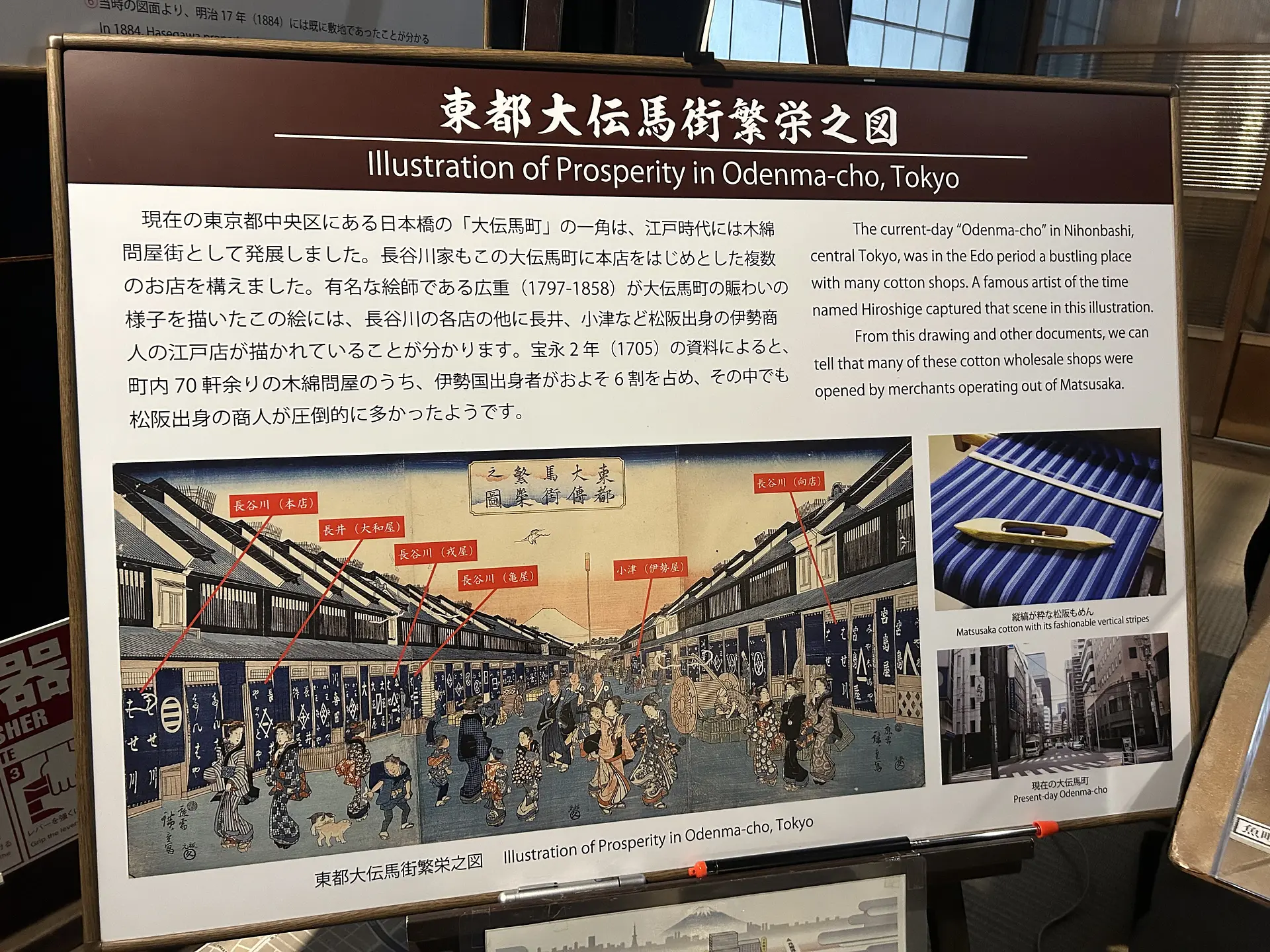こちらは歌川広重の「東都大伝馬街繁栄之図」。江戸時代の大伝馬町(現在の東京・日本橋)の一角を描いた絵ですが、大伝馬町は当時、木綿問屋街として発展しており、町内70軒余りの木綿問屋のうち、伊勢国(三重県)出身者の店が6割を占めており、そのほとんどが松阪商人だったそう。