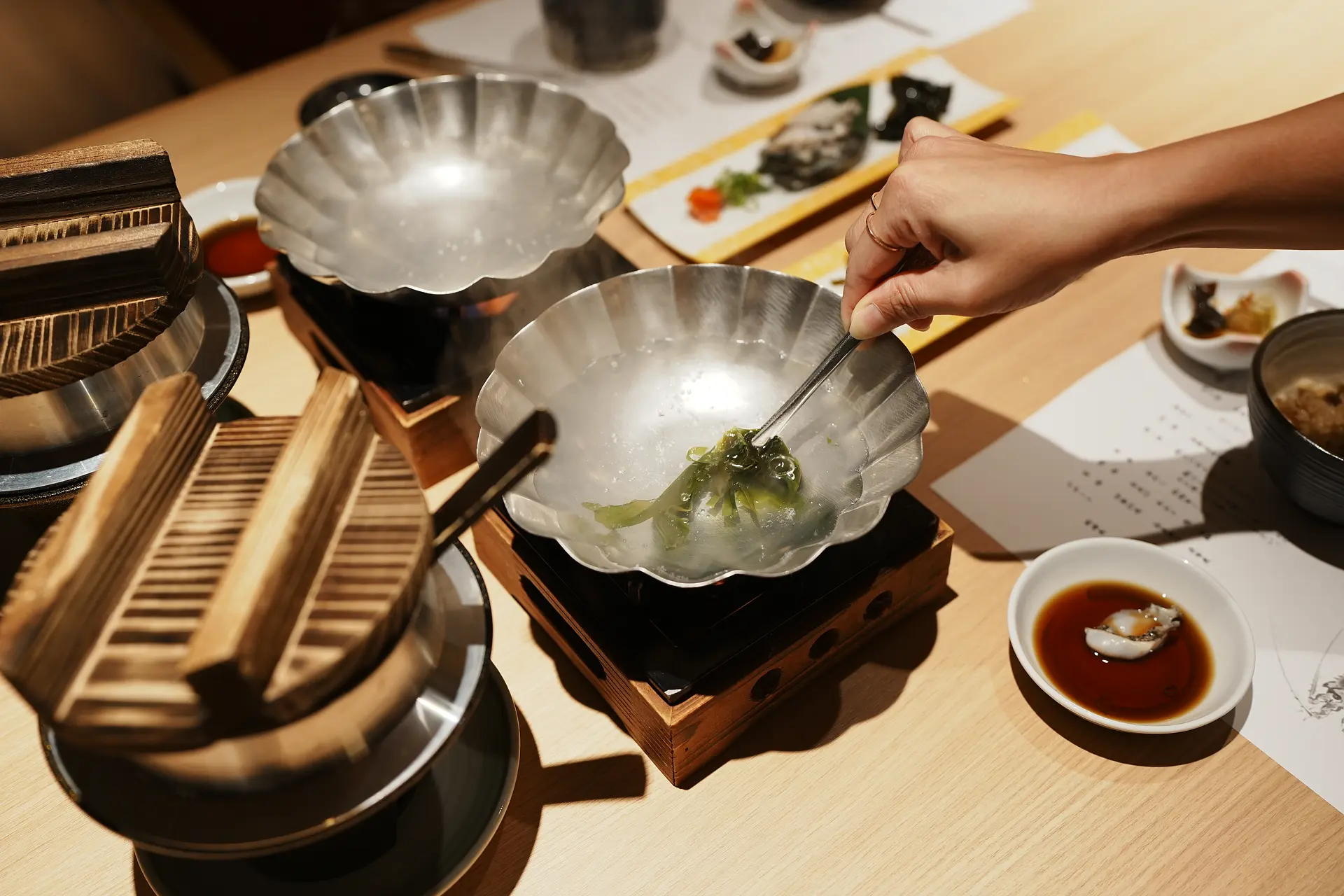 生のわかめを湯通しすると、鮮やかな緑色に変化。想像を超える歯応えある食感と水々しさにびっくり!
