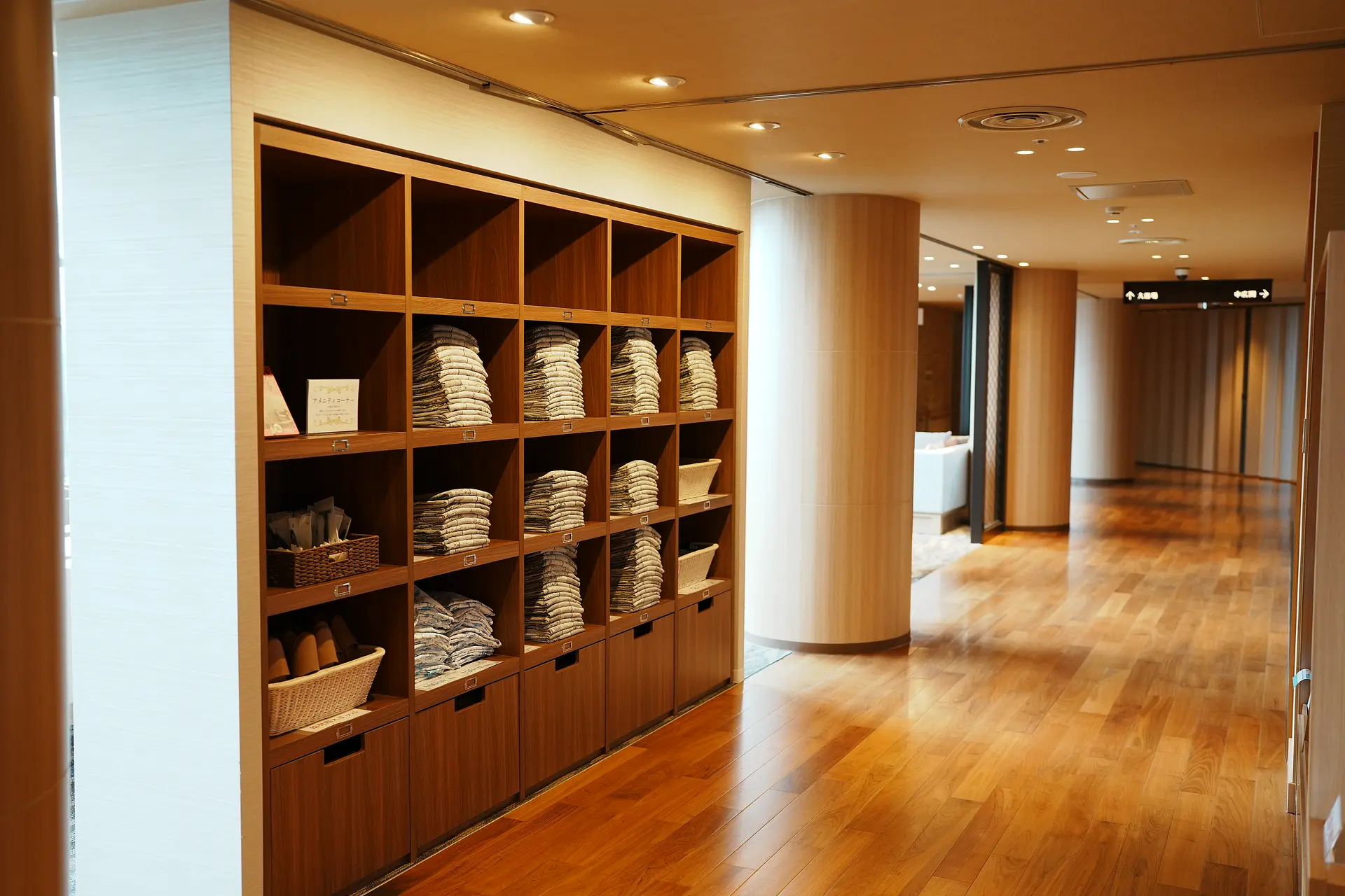ロビー横にはサイズ別に男女浴衣などが用意されています。
