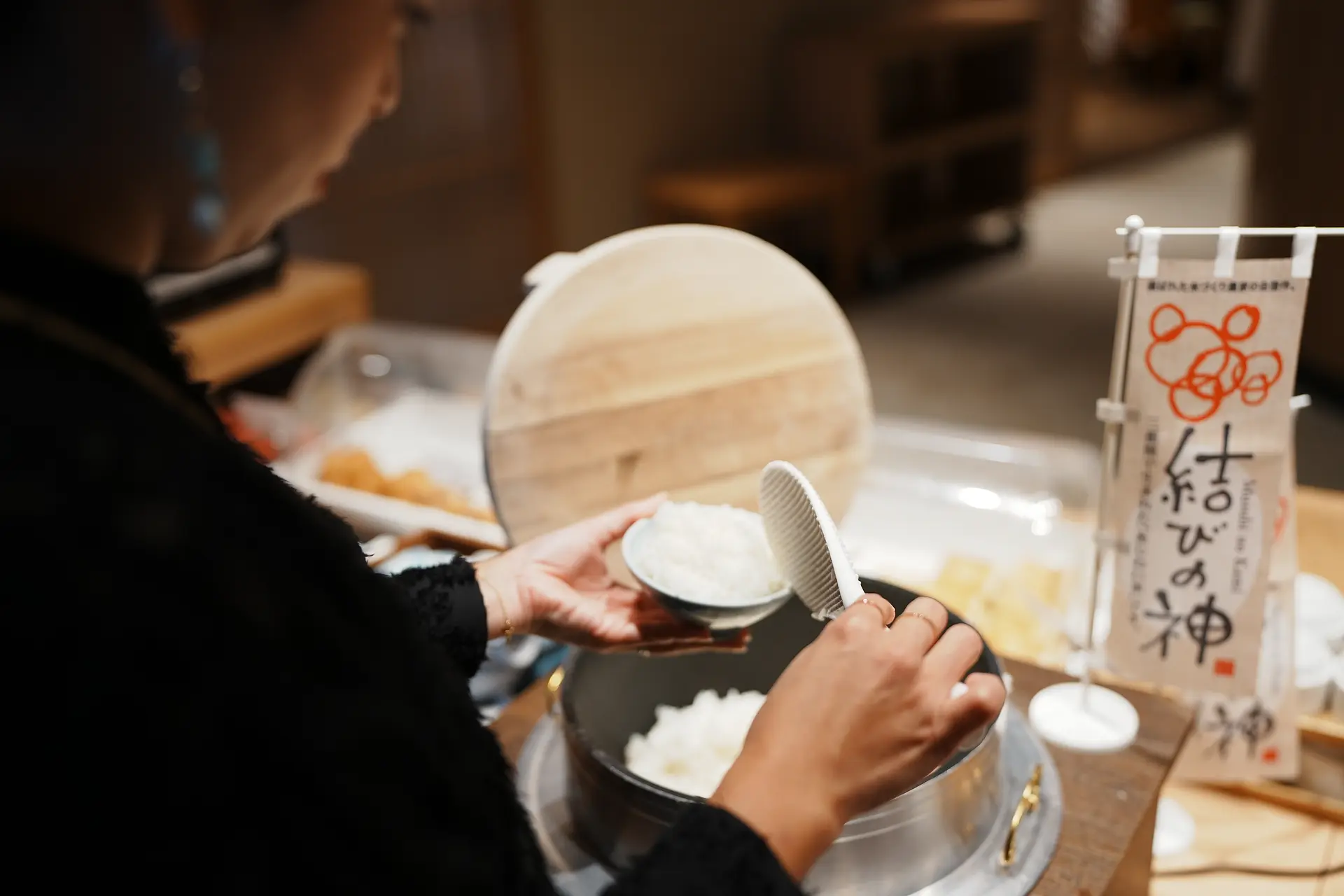 地元三重県で生産され、羽釜で炊飯された「結びの神」という三重県産ブランド米をいただきます。