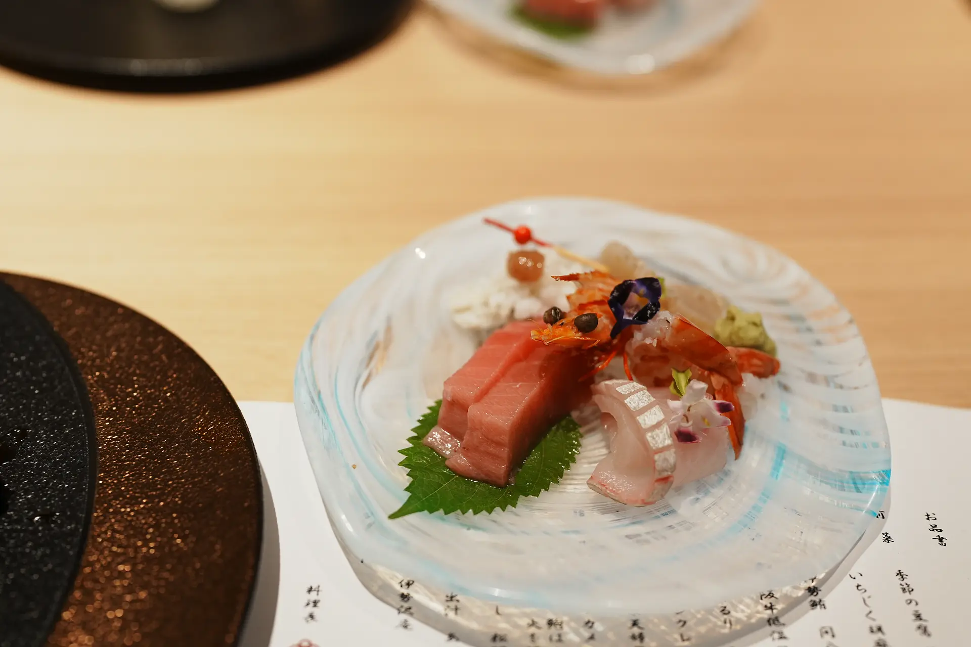 伊勢市で水揚げされた鮪、間八、はも、海老の造り。新鮮な海の幸を堪能。