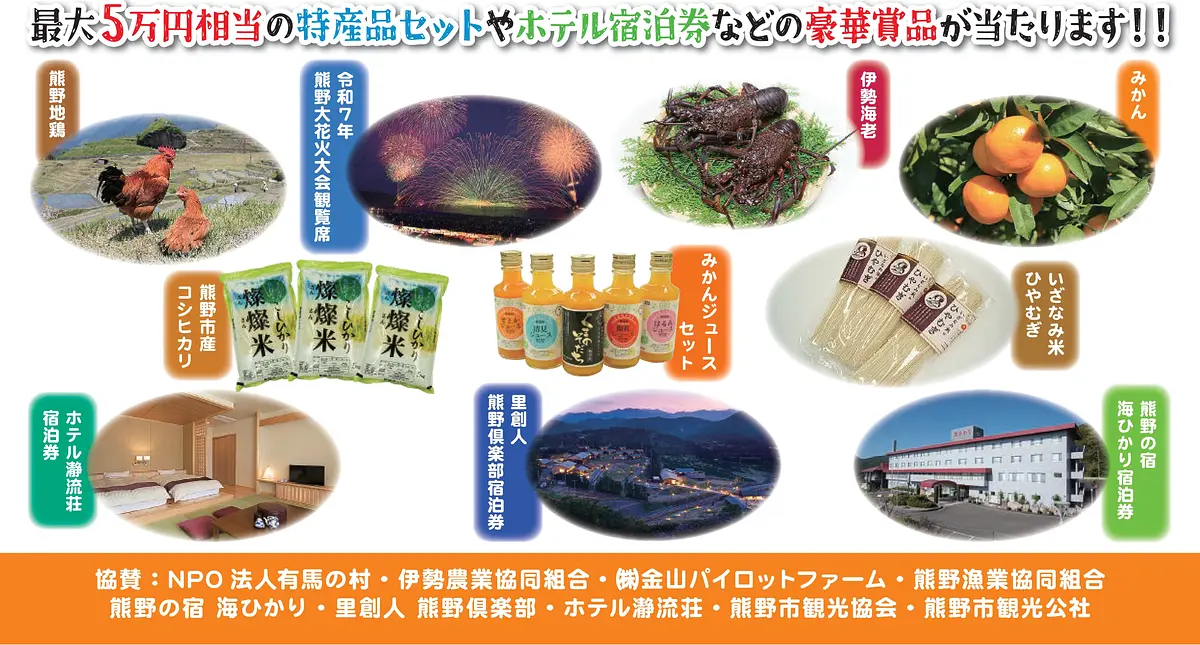 スタンプの獲得数に応じて最大50,000円相当の豪華特産品セットや、伊勢海老やみかんジュース、ホテル宿泊券など地元事業者さん提供の「協賛特別賞品」が当たります!何が当たるかわくわくしながらスタンプ集めを楽しんでみてくださいね♪