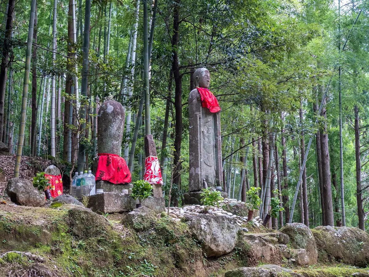 竹林に囲まれた峠まで登ると、大きなお地蔵様が出迎えてくれます。お地蔵様の左裾には小さな穴があり、鉄砲で撃たれた傷といわれています。江戸時代のはじめ、鉄砲の名手「大馬新左衛門」が夕暮れ時に松本峠を通ったところ、朝通った時にはなかった大きな地蔵が立っていったため、妖怪と間違えて鉄砲で撃ってしまったとか。