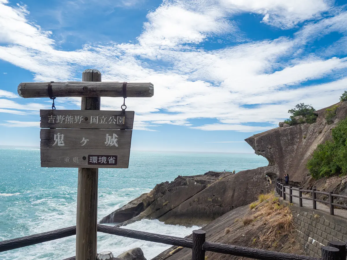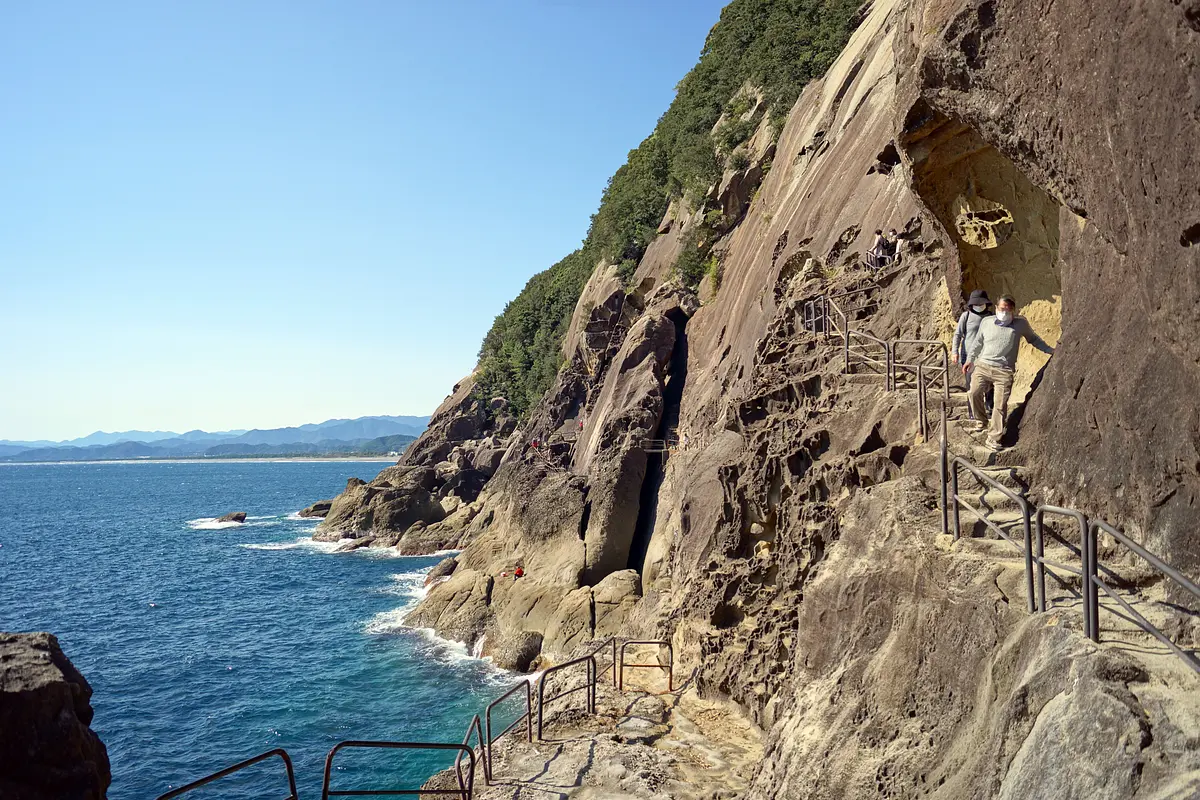 岸壁には約1キロにわたって遊歩道が整備されていて、大小無数の洞窟や奇岩気象を楽しむことができます。国の名勝及び天然記念物に指定されているほか、「紀伊山地の霊場と参詣道」の一部として世界遺産に登録されています。