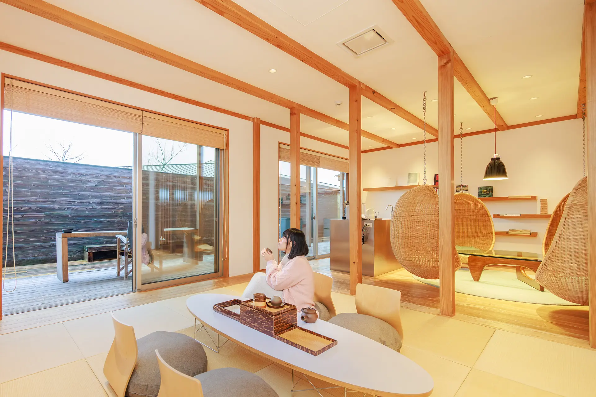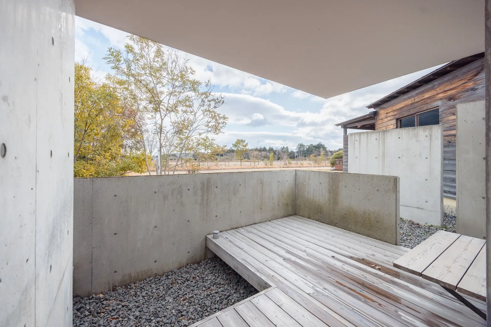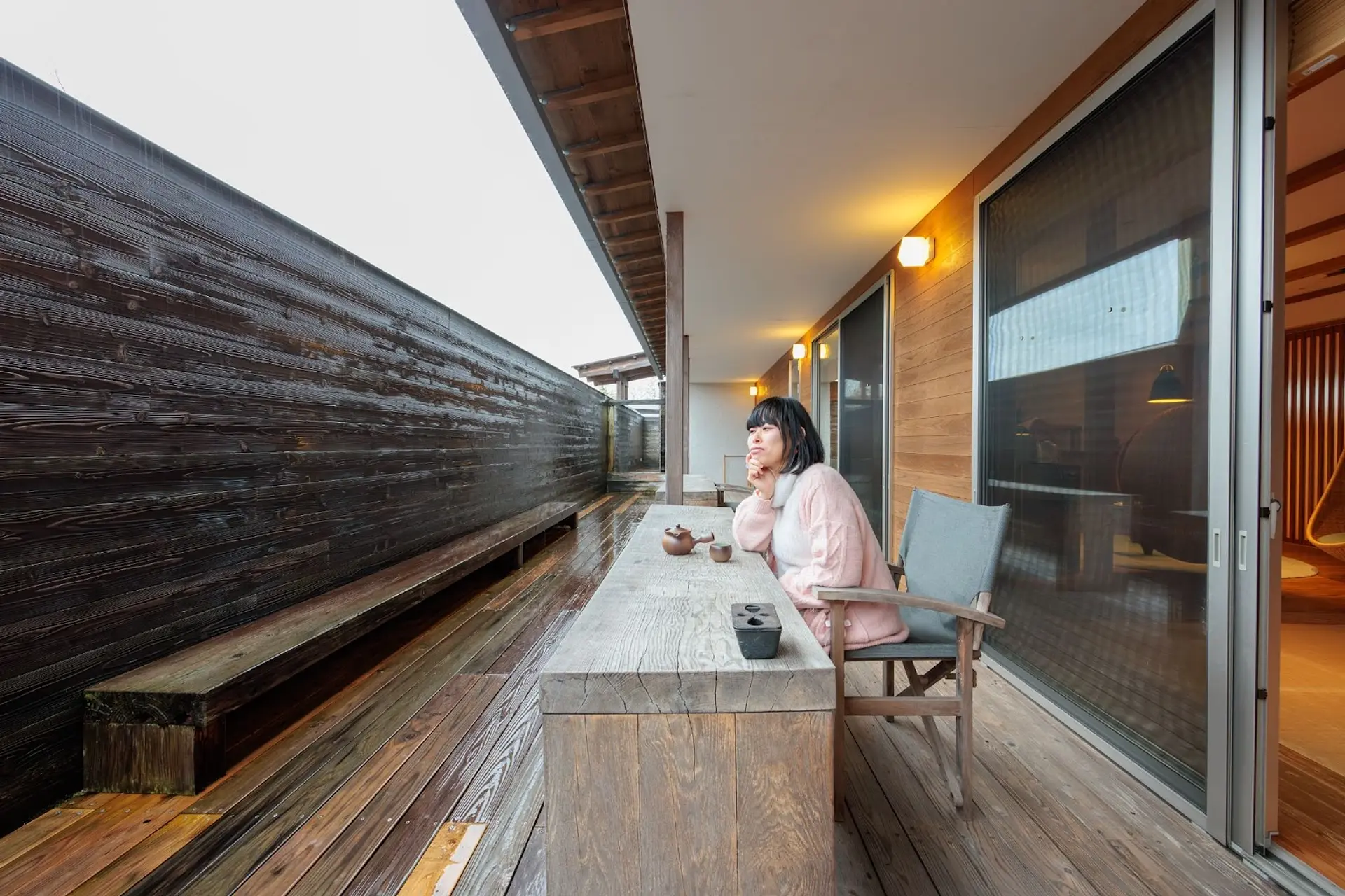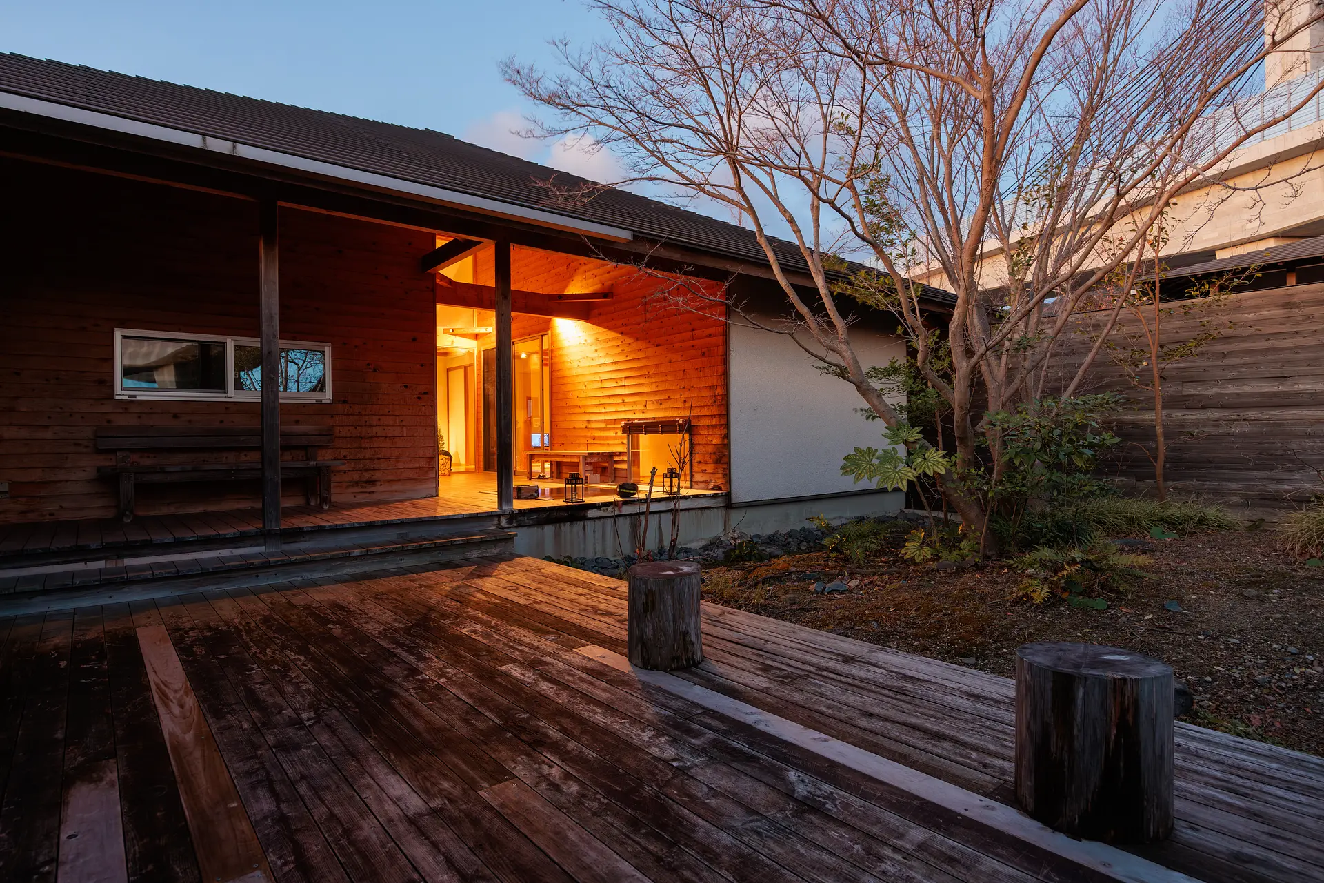 「檜」の棟は、まるで中庭のようなデッキテラスが特徴的。