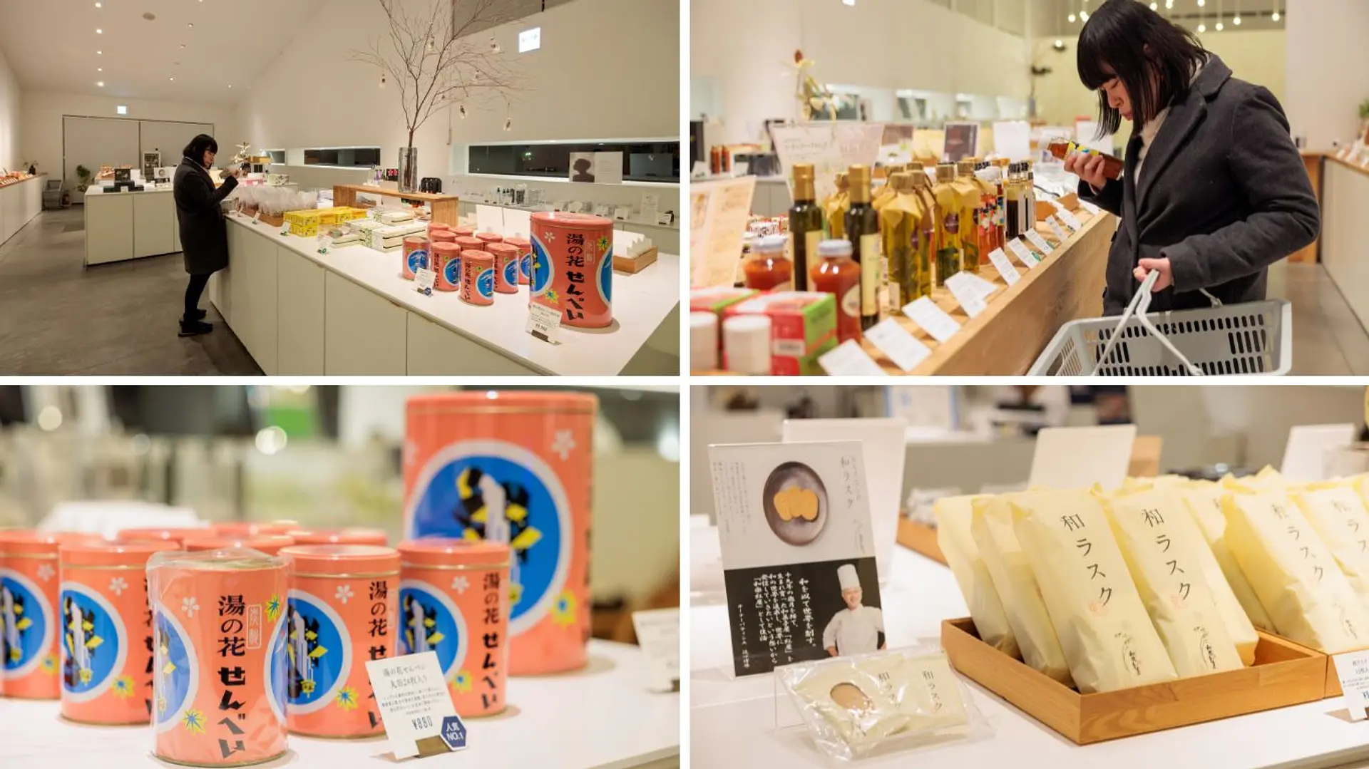 湯の山温泉の名物「湯の花せんべい」やアクアイグニスのオリジナル商品のほか、辻󠄀口博啓さん監修のお菓子、笠原将弘さん監修のドレッシングなど、この地域でしか手に入らないお土産がたくさんそろっています。