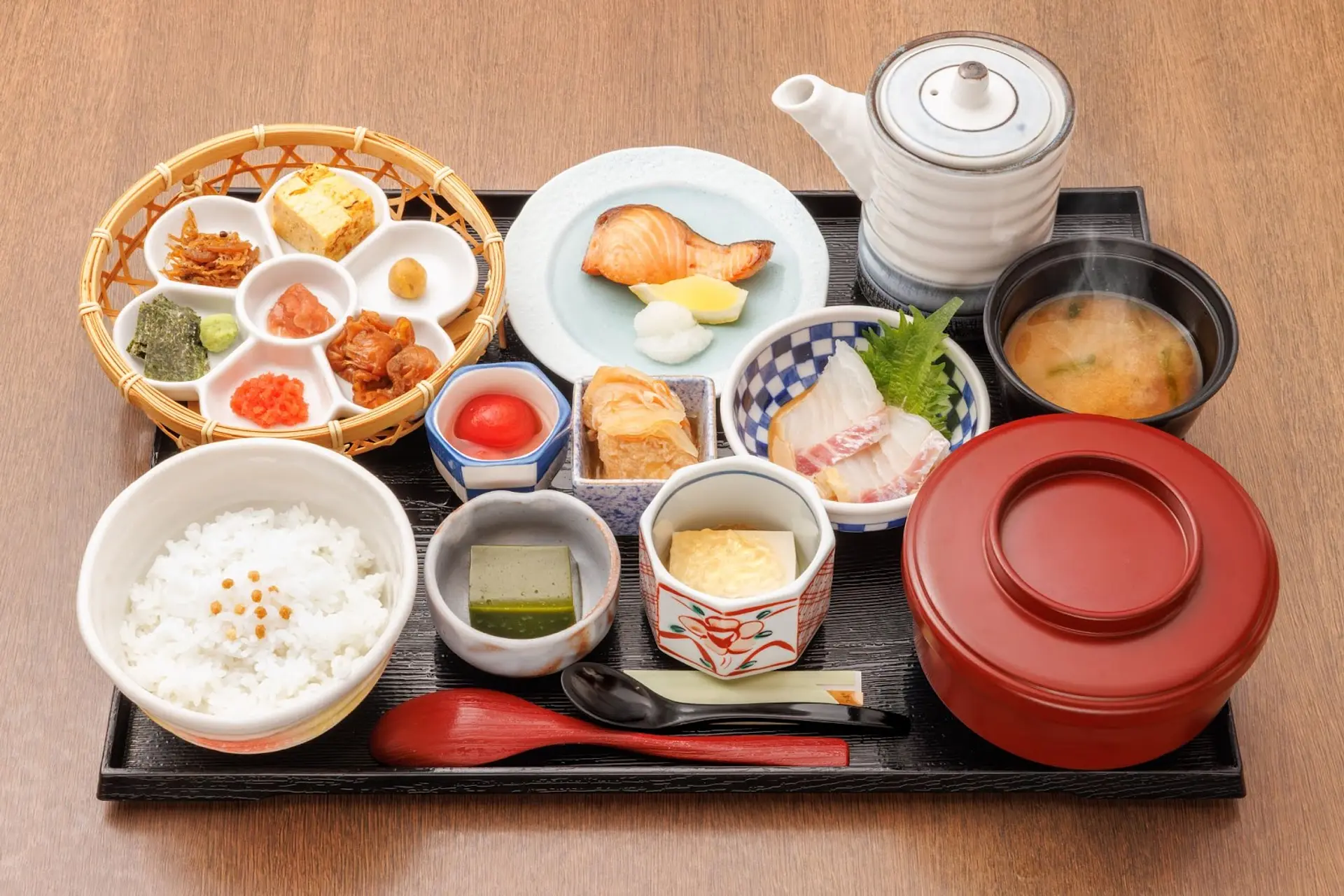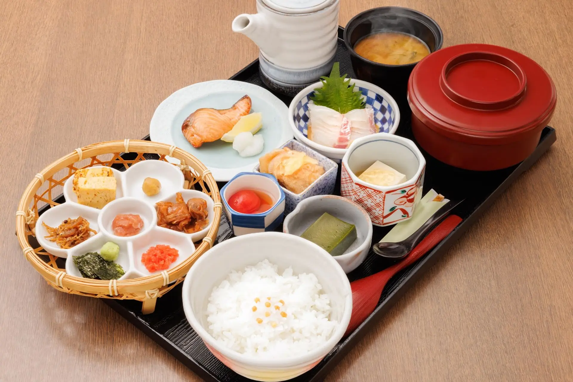 鯛茶漬けに加え、焼き魚や彩り豊かな小鉢も並びます。
