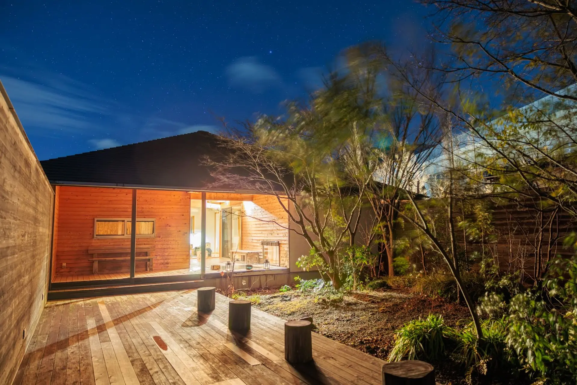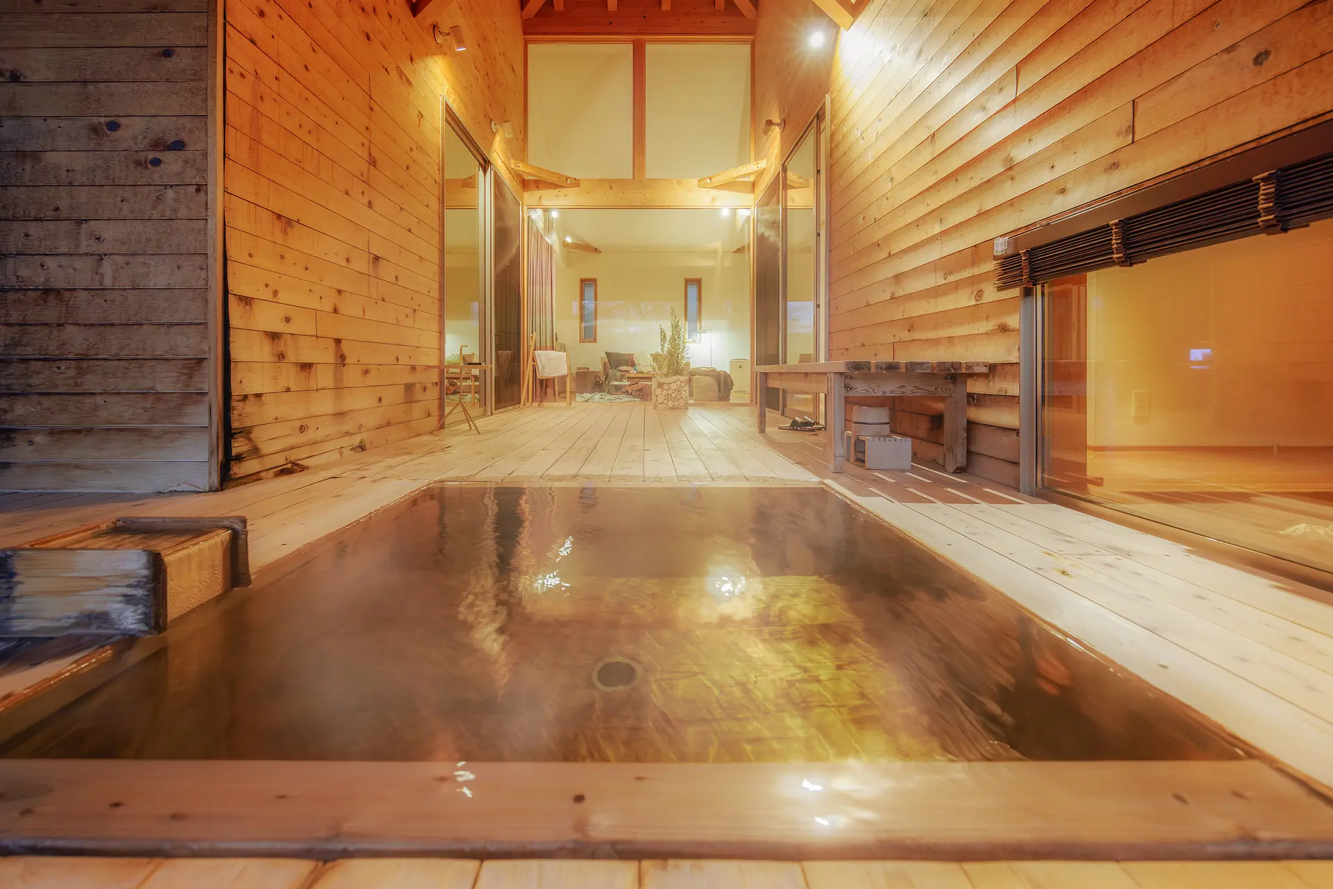 さらに、寝室近くの通路からは露天風呂へアクセスでき、部屋の隅にひっそりと佇むその露天風呂は、まさに隠れた癒しスポット。