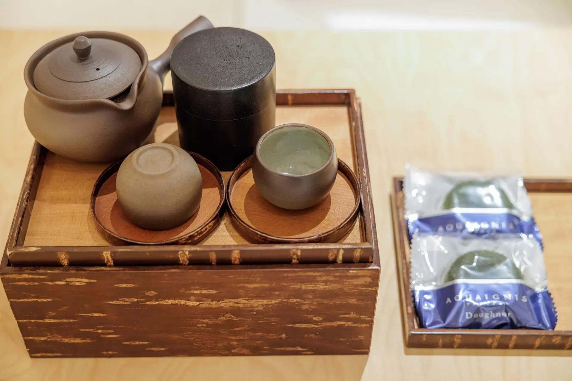 和室のテーブルには、湯呑みセットとアクアイグニスオリジナルのお菓子が用意されていました。