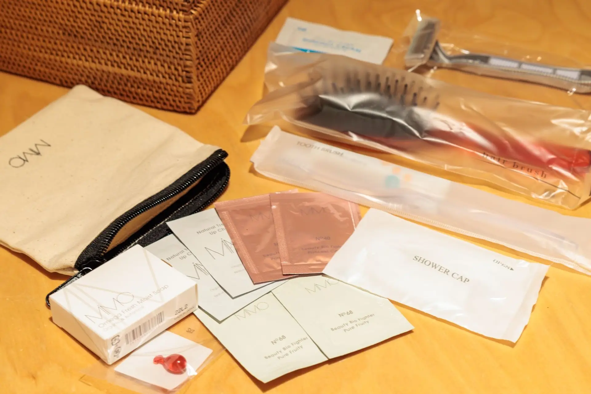 アメニティには、基礎化粧品や歯ブラシ、ひげそり、くし、ルームウェア、タオルなど、必要なものが全て揃っており、これらのアメニティは離れ全棟で用意されています。