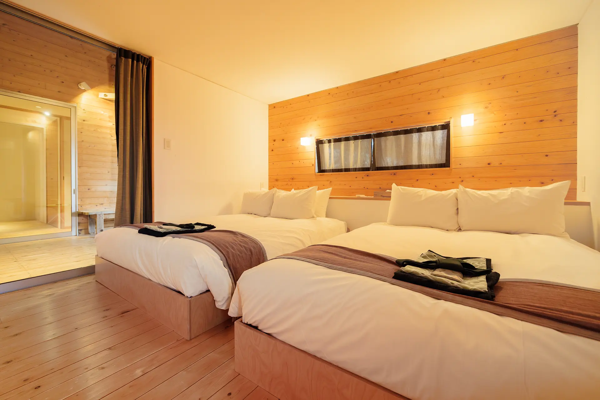 寝室のベッドは広々としており、木の温もりと香りが漂う心地よい空間で、ゆったりと就寝できました。