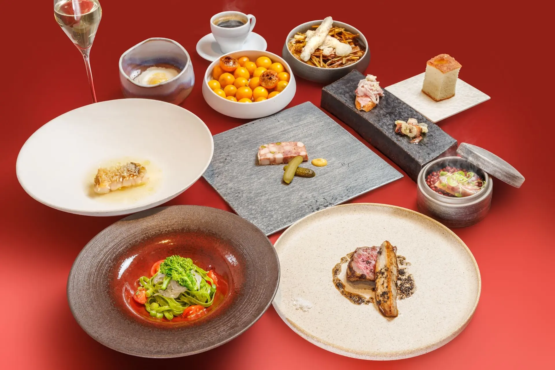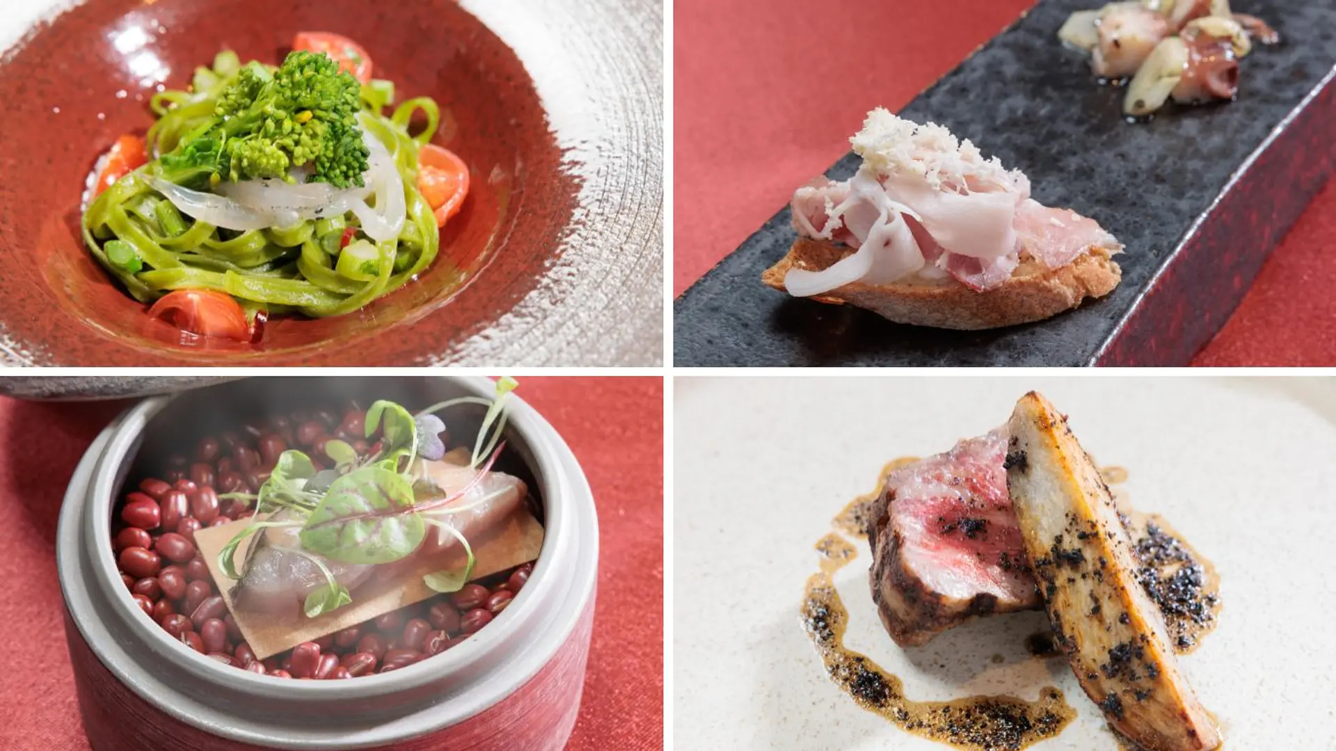 蓋を開けると煙が立ち上る演出や、形の異なる美しい器に盛られた料理の数々。