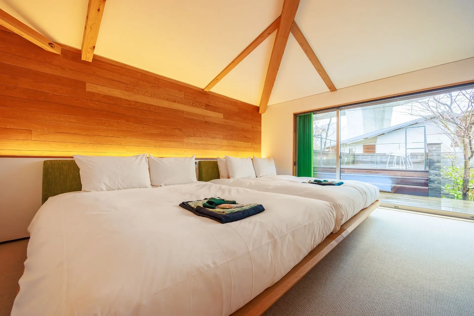 カーテンを開けると、窓越しにデッキテラスと露天風呂が見える設計になっていて、窓を開ければそのままテラスに出られる造りです。