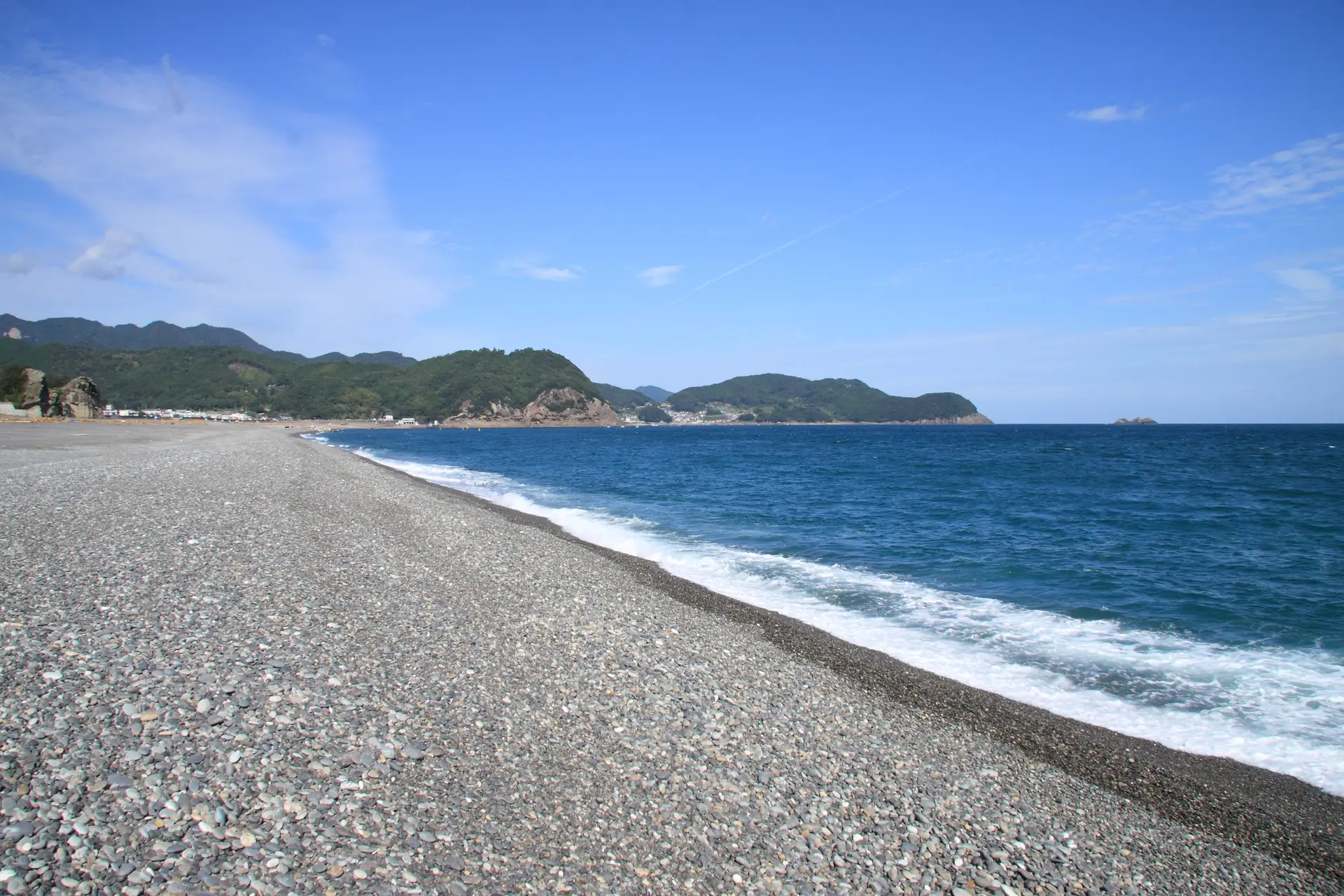 荒々しい黒潮をおおらかに受けとめるこちらの浜には、熊野川の上流から新宮を経て、熊野灘の荒波に磨かれた小石が敷き詰められています。「みはま小石」と呼ばれる色とりどりの小石は、“拾い子さん”の手によって拾われ、アクセサリーなどに利用されています。また、アカウミガメの上陸地としても知られています。