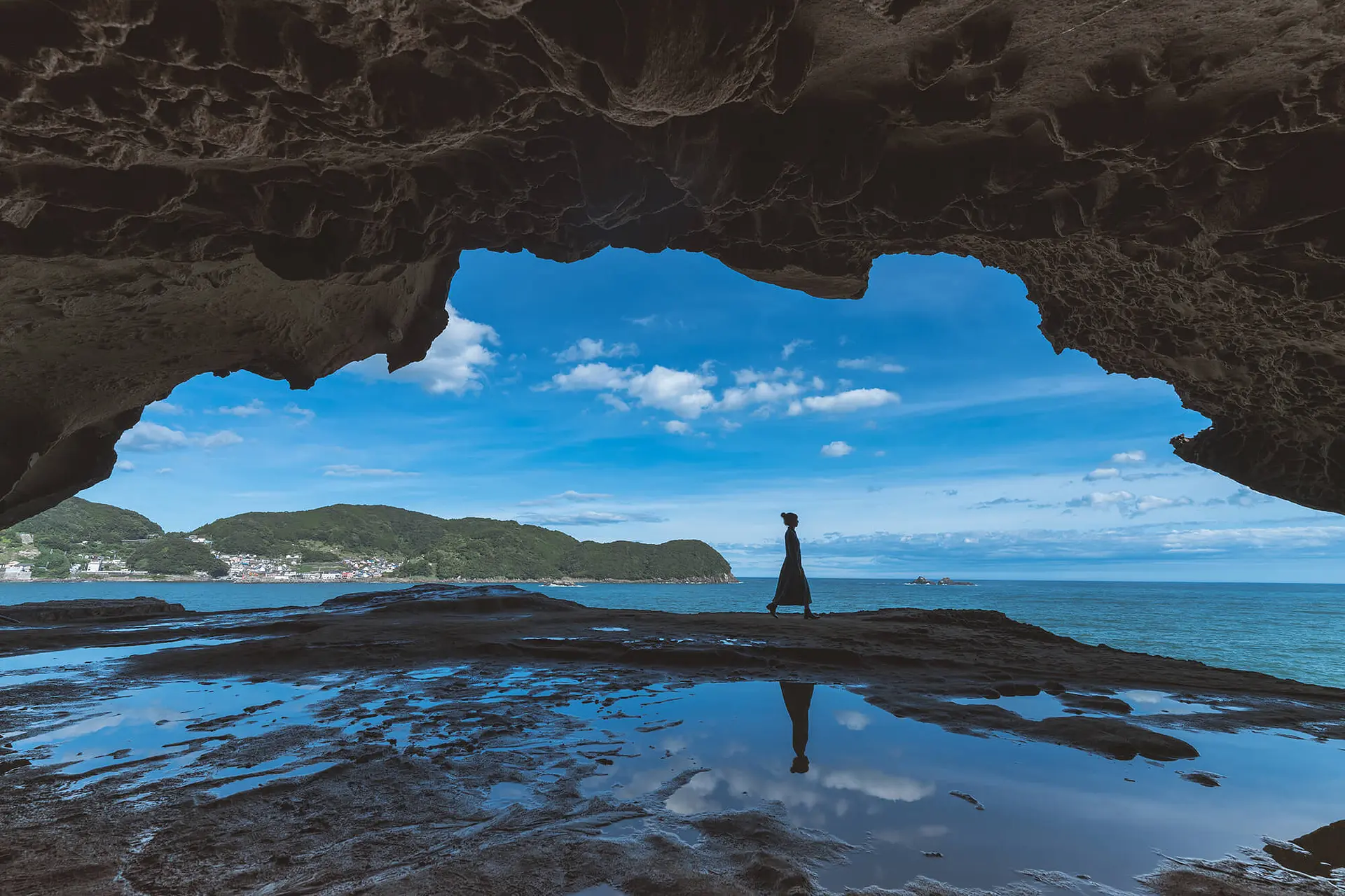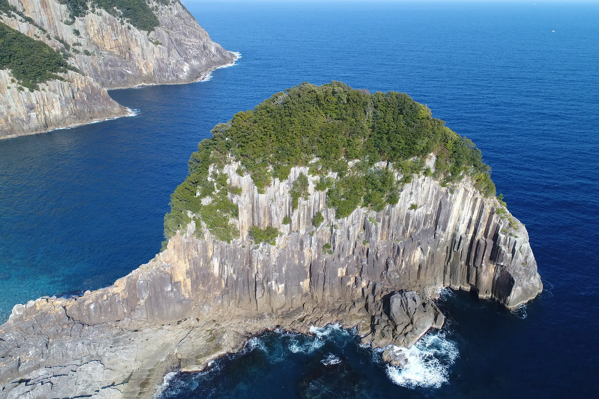 約1500万年前のカルデラ火山活動により形成され、いくつもの柱が連なって立ったように見える「柱状節理(ちゅうじょうせつり)」の岸壁がそびえ立つ楯ヶ崎。楯ヶ崎園地に整備された遊歩道にある千畳敷からは、楯ヶ崎の壮大なスケールを目の前で感じることができます。その壮大さをぜひ写真に収めてみてはいかが?