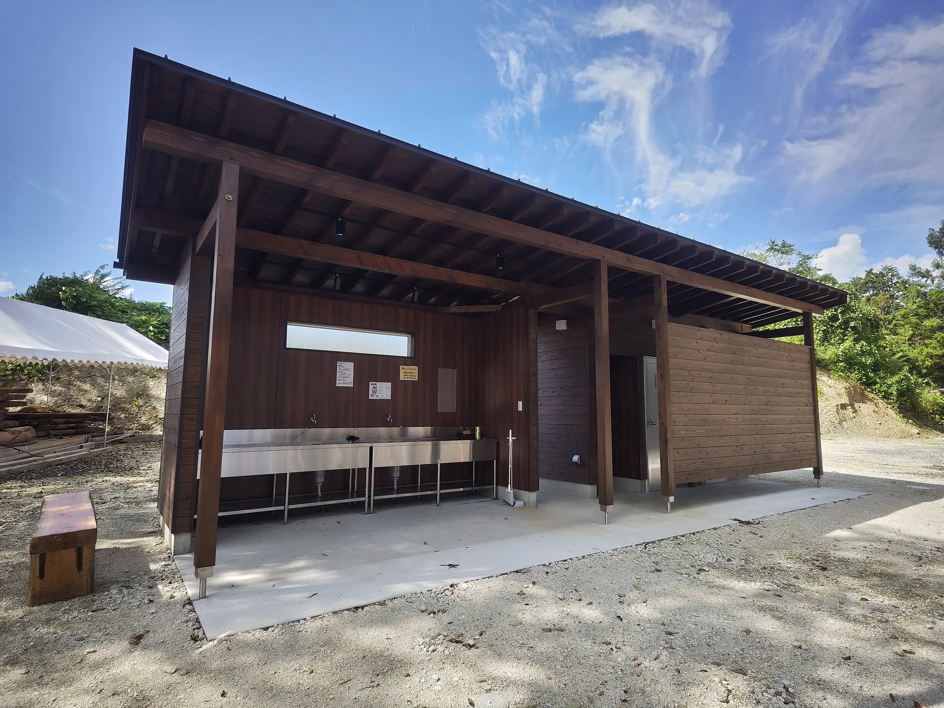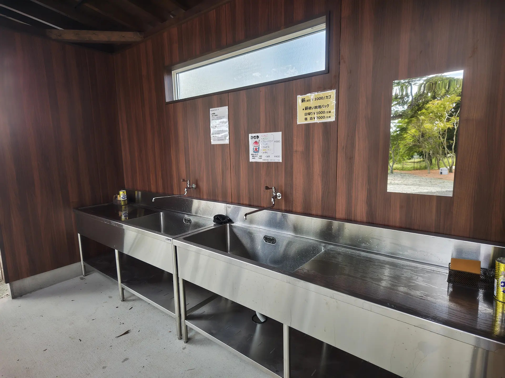 炊事場は林間エリアに2か所、池畔エリア&トレーラーハウスエリアに2か所あります。トレーラーハウス内にはキッチンがありませんので、炊事場はこちらをご利用ください。
