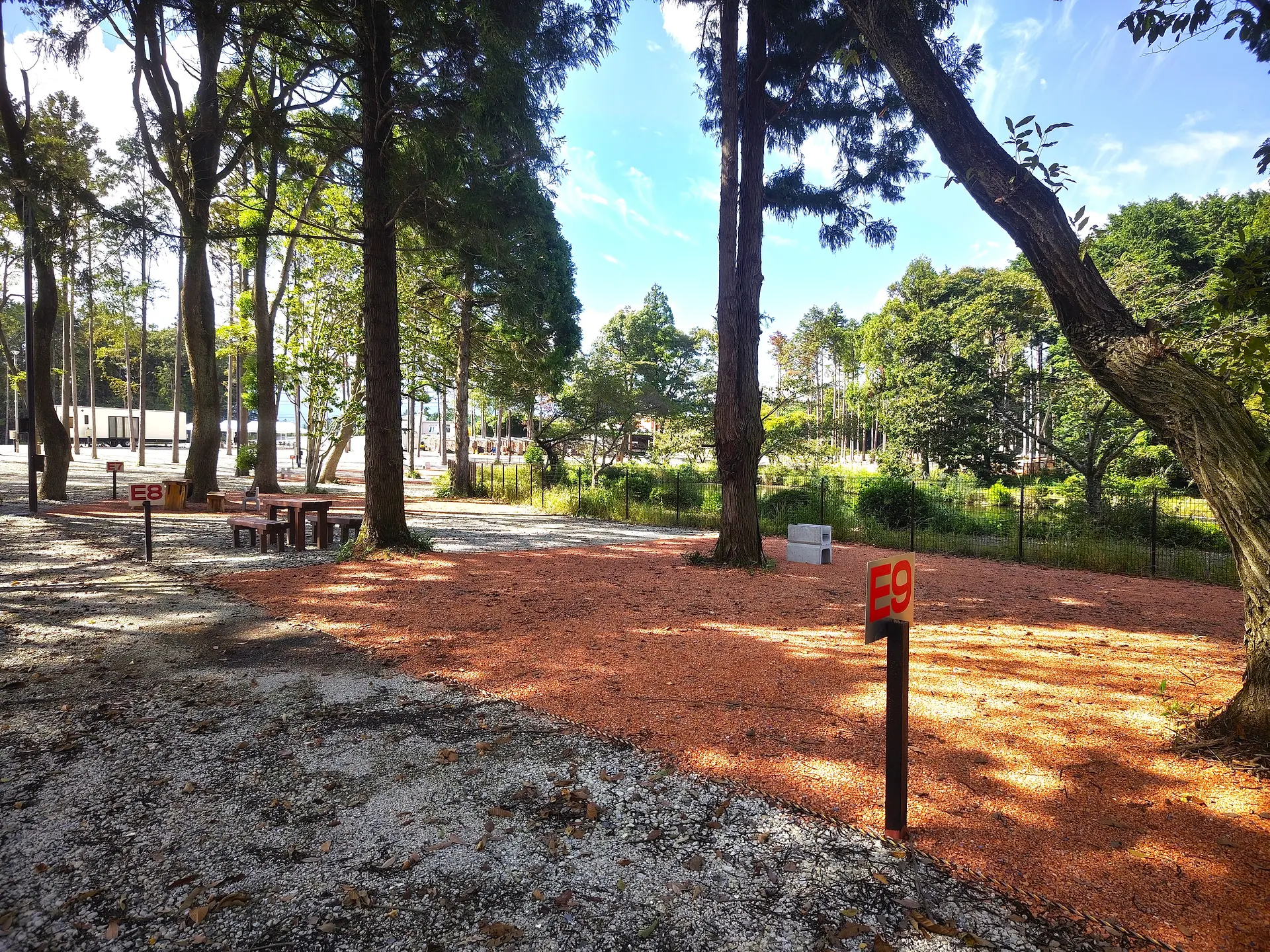 電源ありの池畔エリアは10区画。林間エリアと同様で、1区画の広さは約10m×12m、利用人数も1区画最大6名までとなります。フェンスの向こうには、隣接する「昭和幸福村公園」の池が見えます。(池には入れません。)