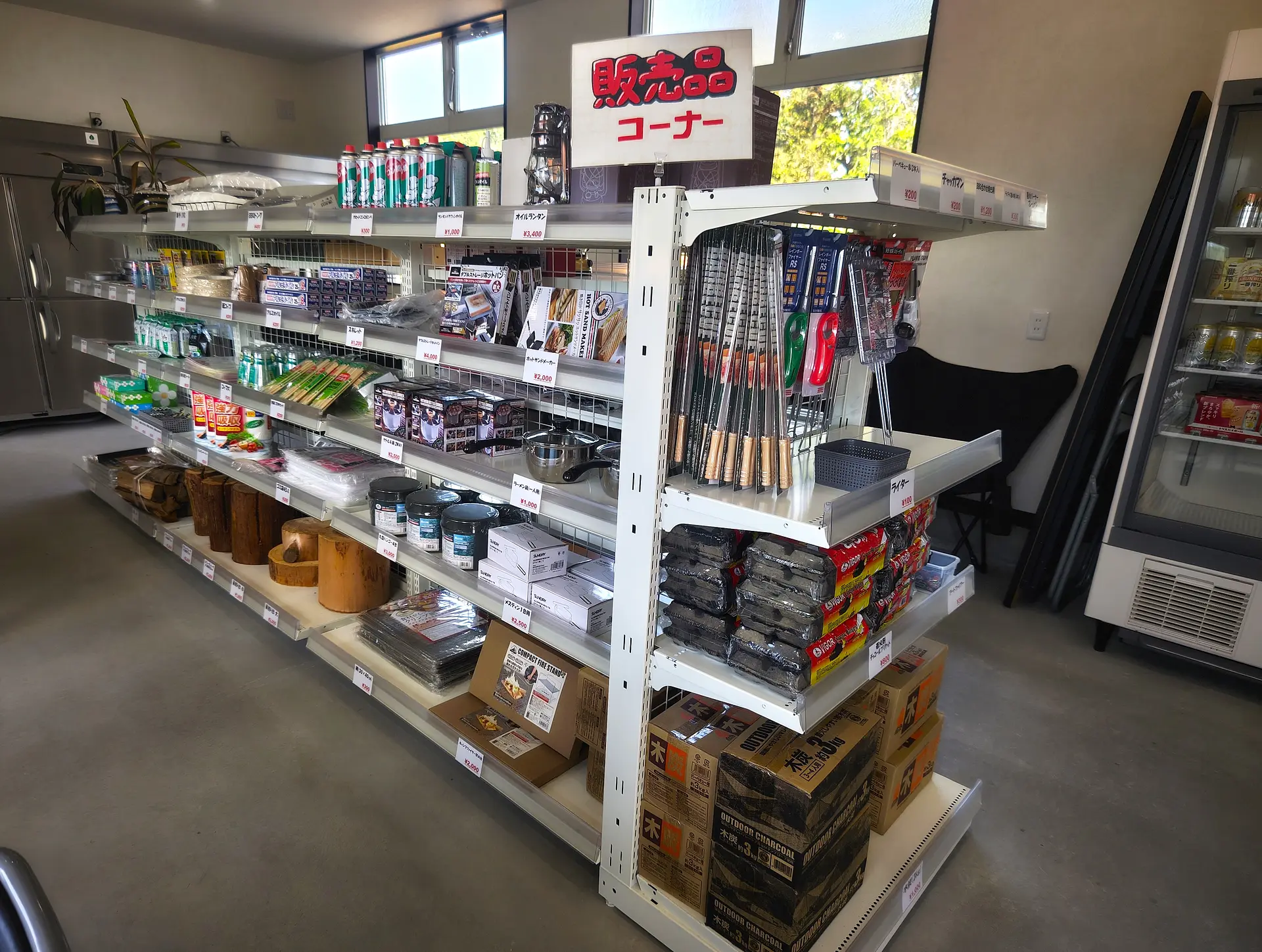 管理棟は受付カウンターだけでなく、キャンプ用品や消耗品の販売コーナーやレンタルコーナーがあり、夏にはかき氷も販売されているそうです!大きな冷蔵庫もあり、冷えたドリンクや氷も販売しているのはありがたいですね!