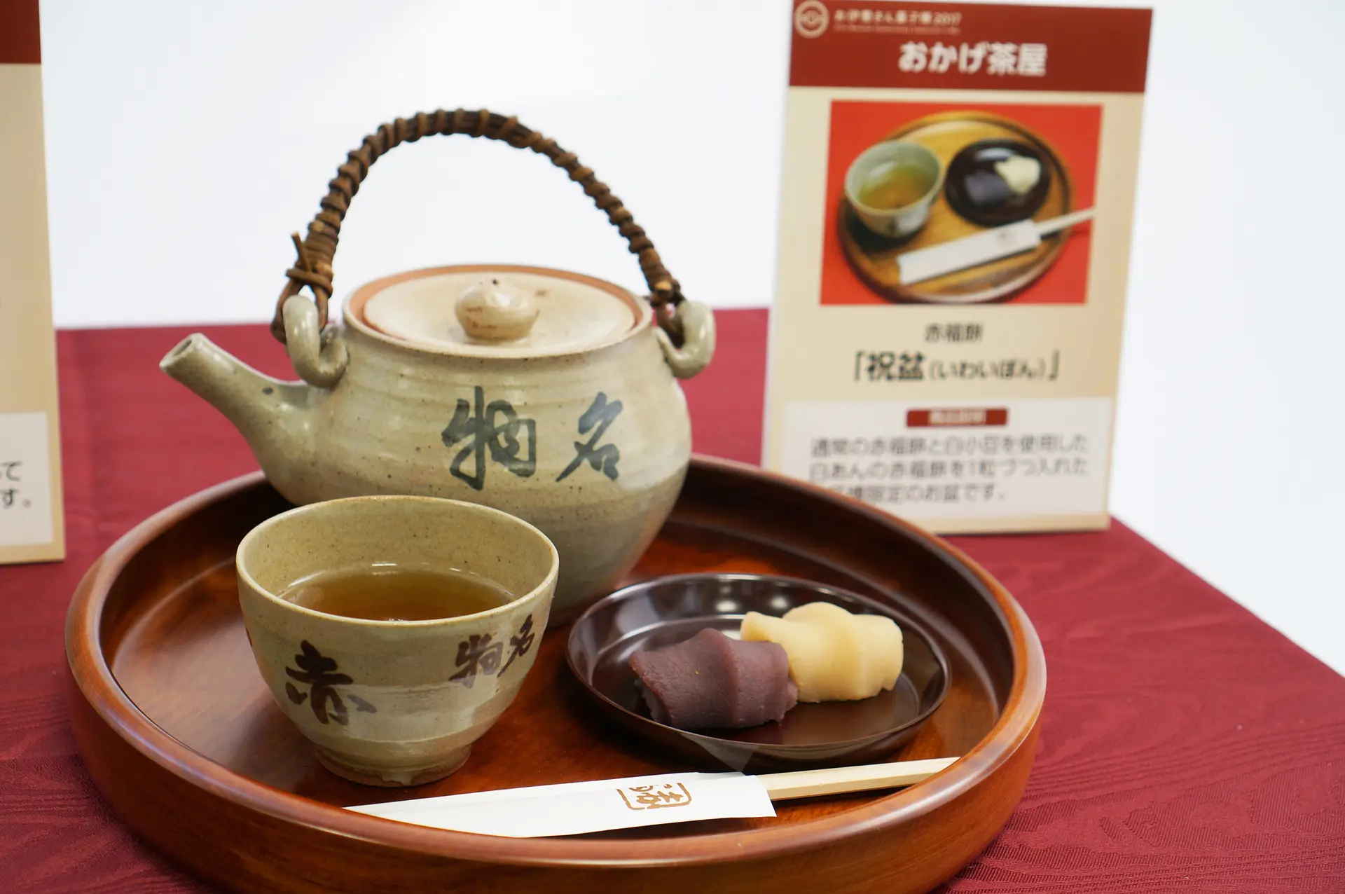なお、お伊勢さん菓子博では「みえ・食のゾーン」内の「おかげ茶屋 甘味処」で「赤福餅 祝盆」(価格:210円)が販売されます。(お召し上がりのみで、お土産としての販売はありません)