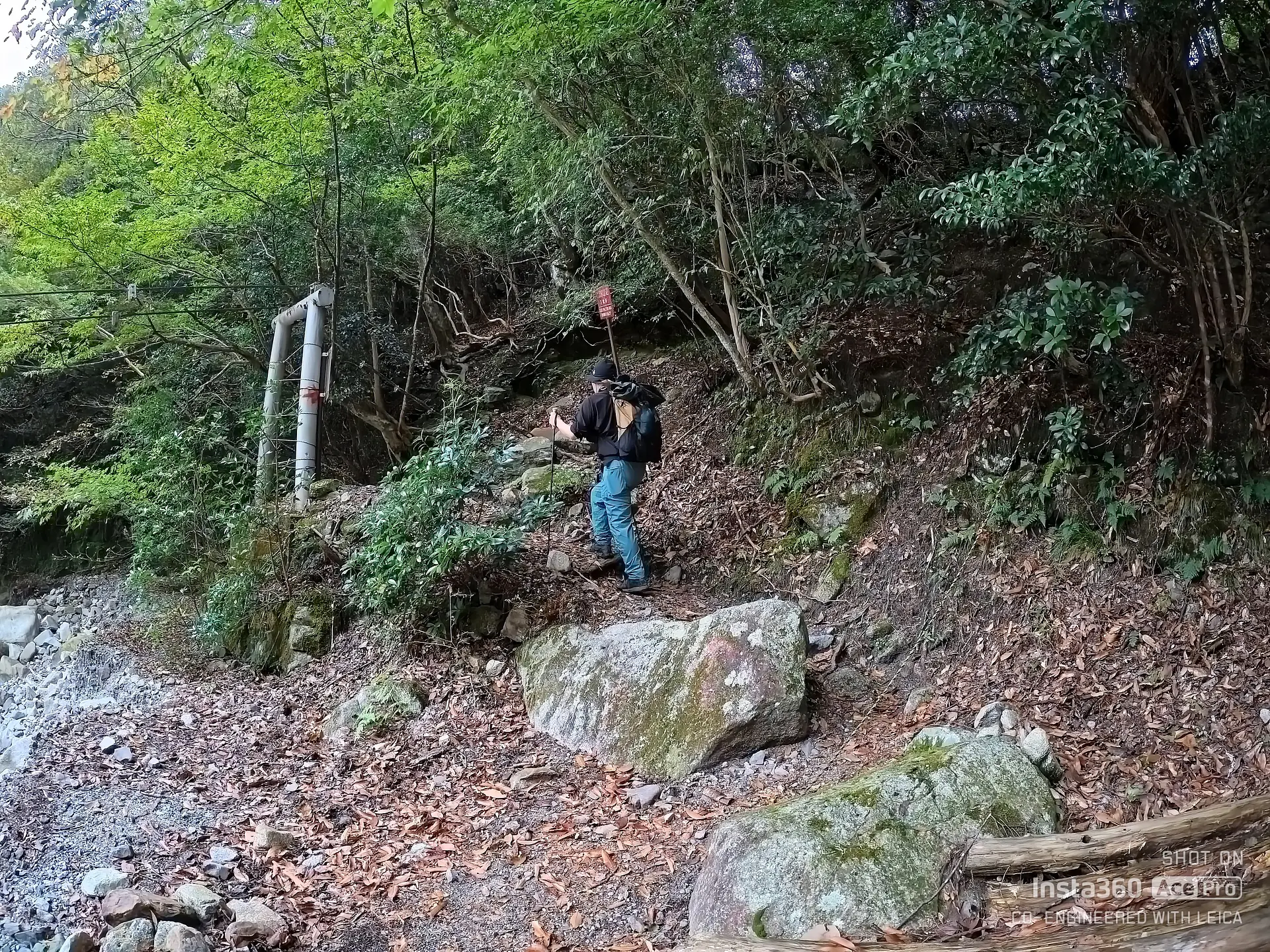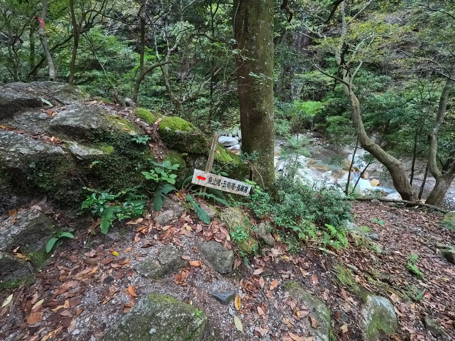 魚止滝から先ほどの看板の場所まで戻ります。今度は、「山沿いコース 五階滝・長尾滝」の看板の矢印の方向に進みます。