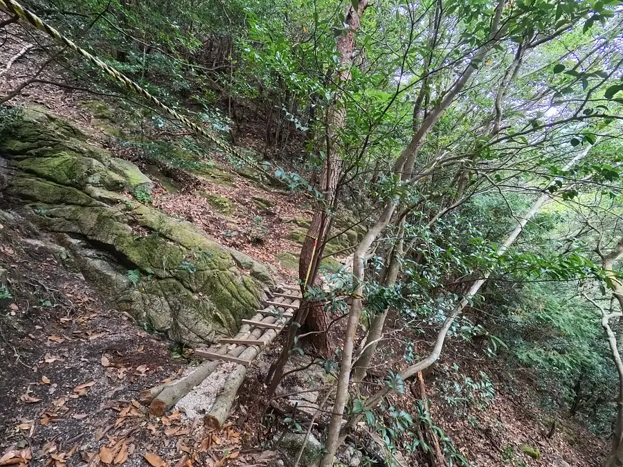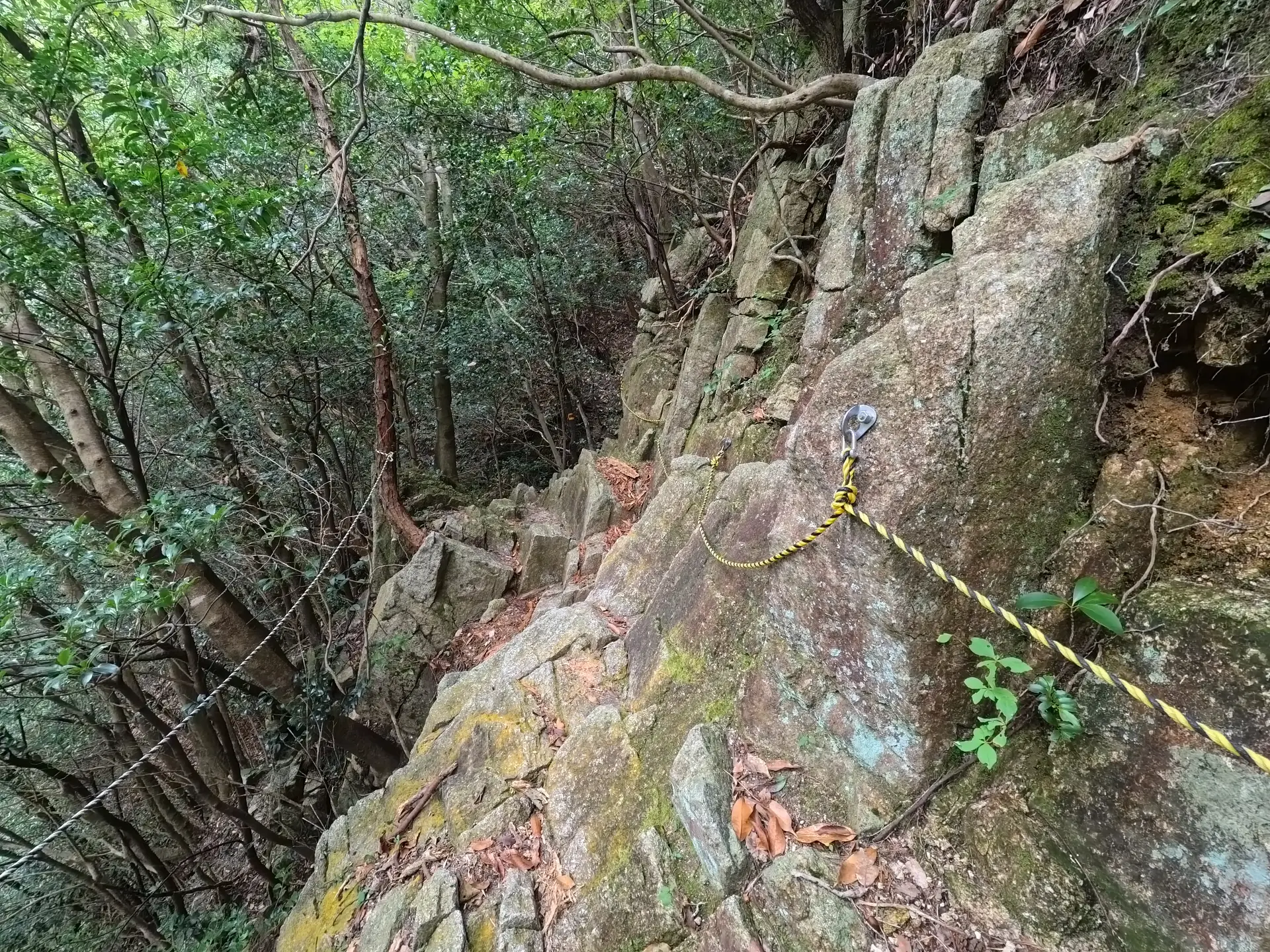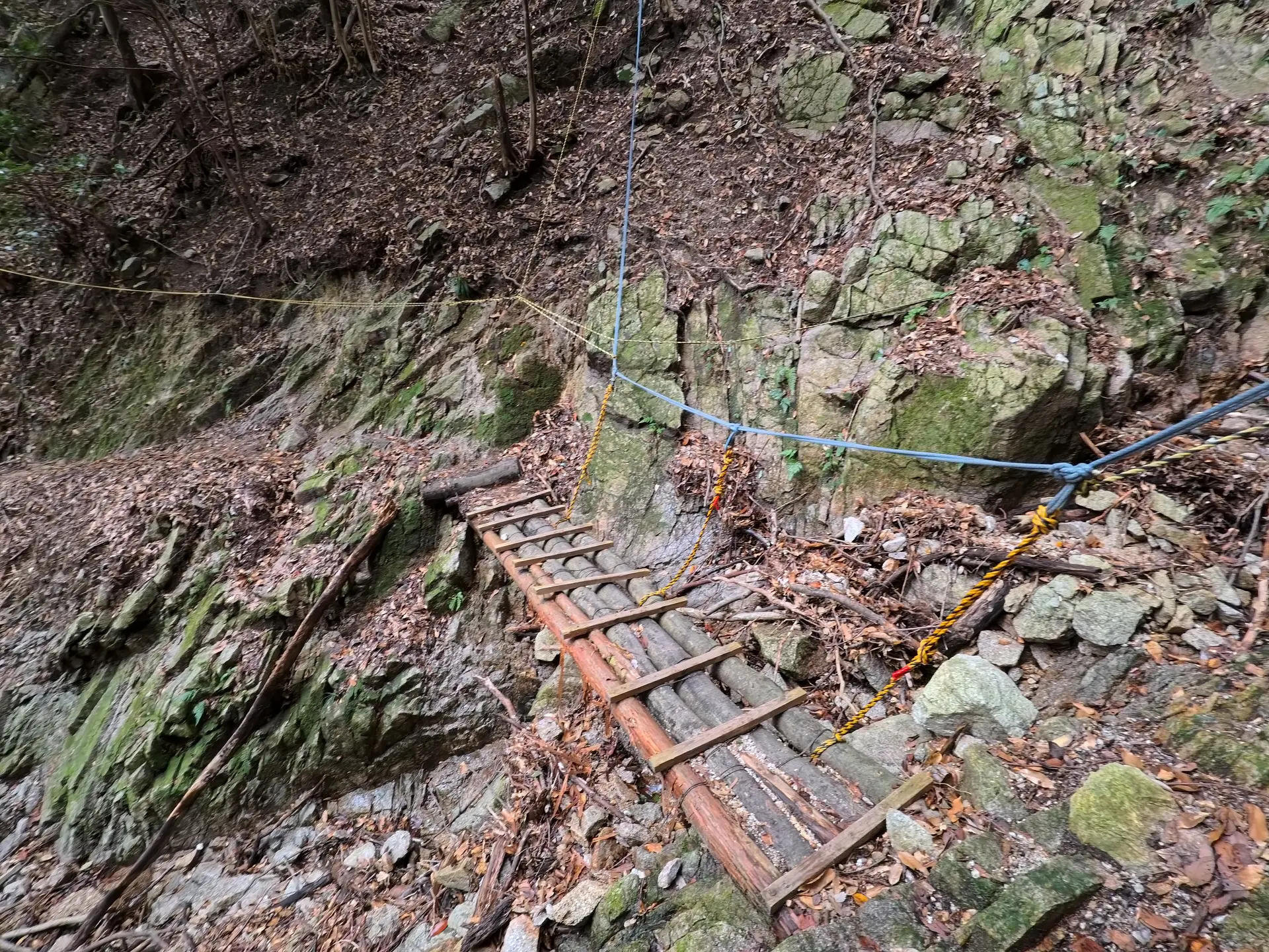 さらに奥の登山道へ進みます。先ほどと同じような木の橋、さらに進むとロープが張られた岩場があります。