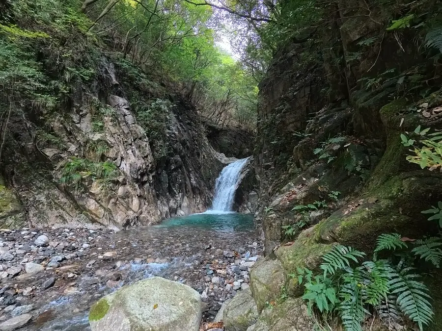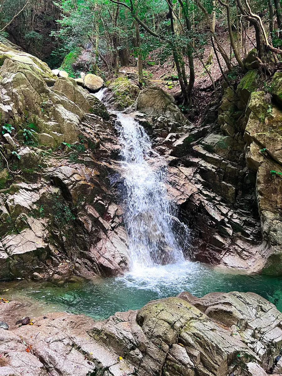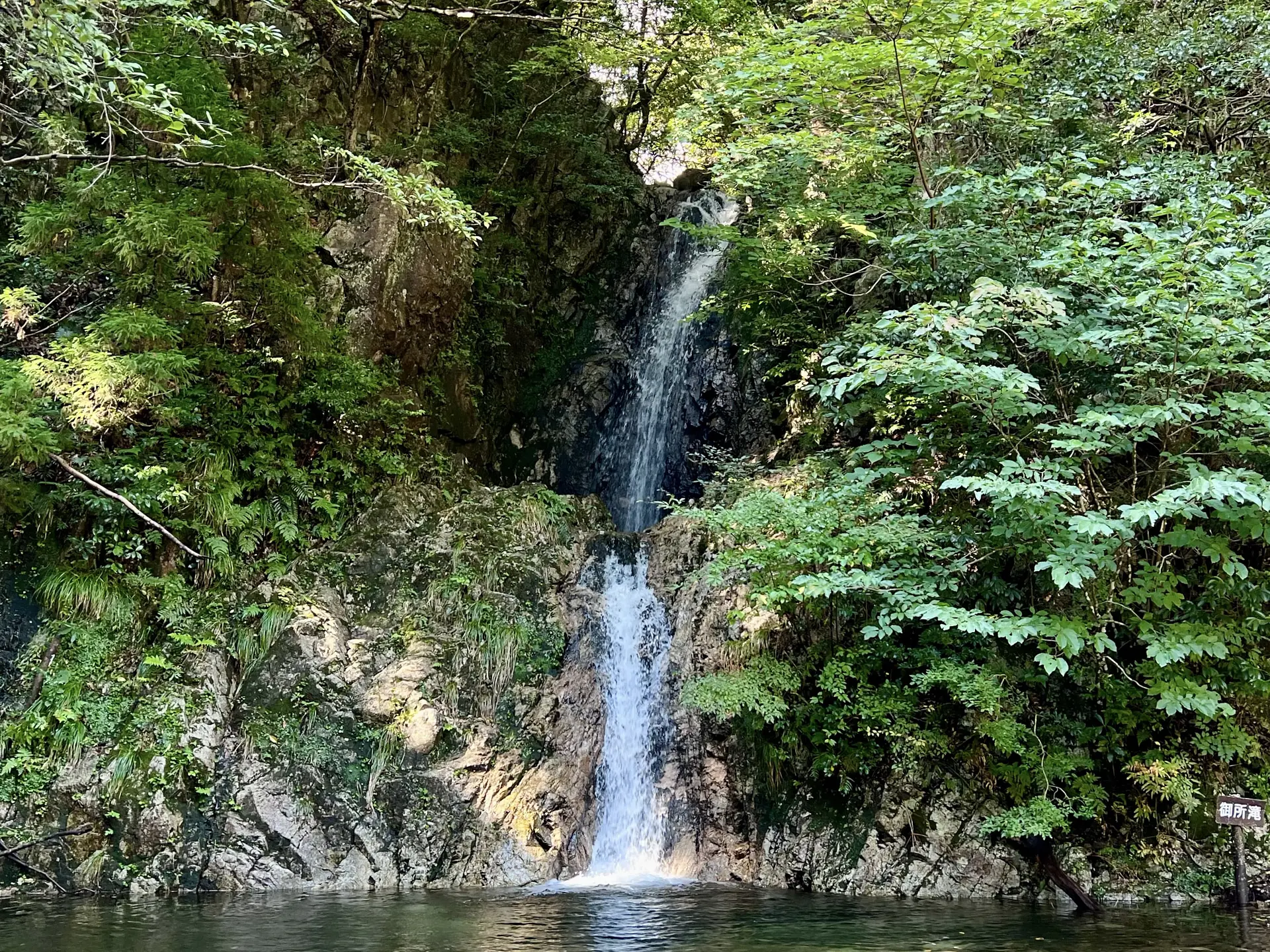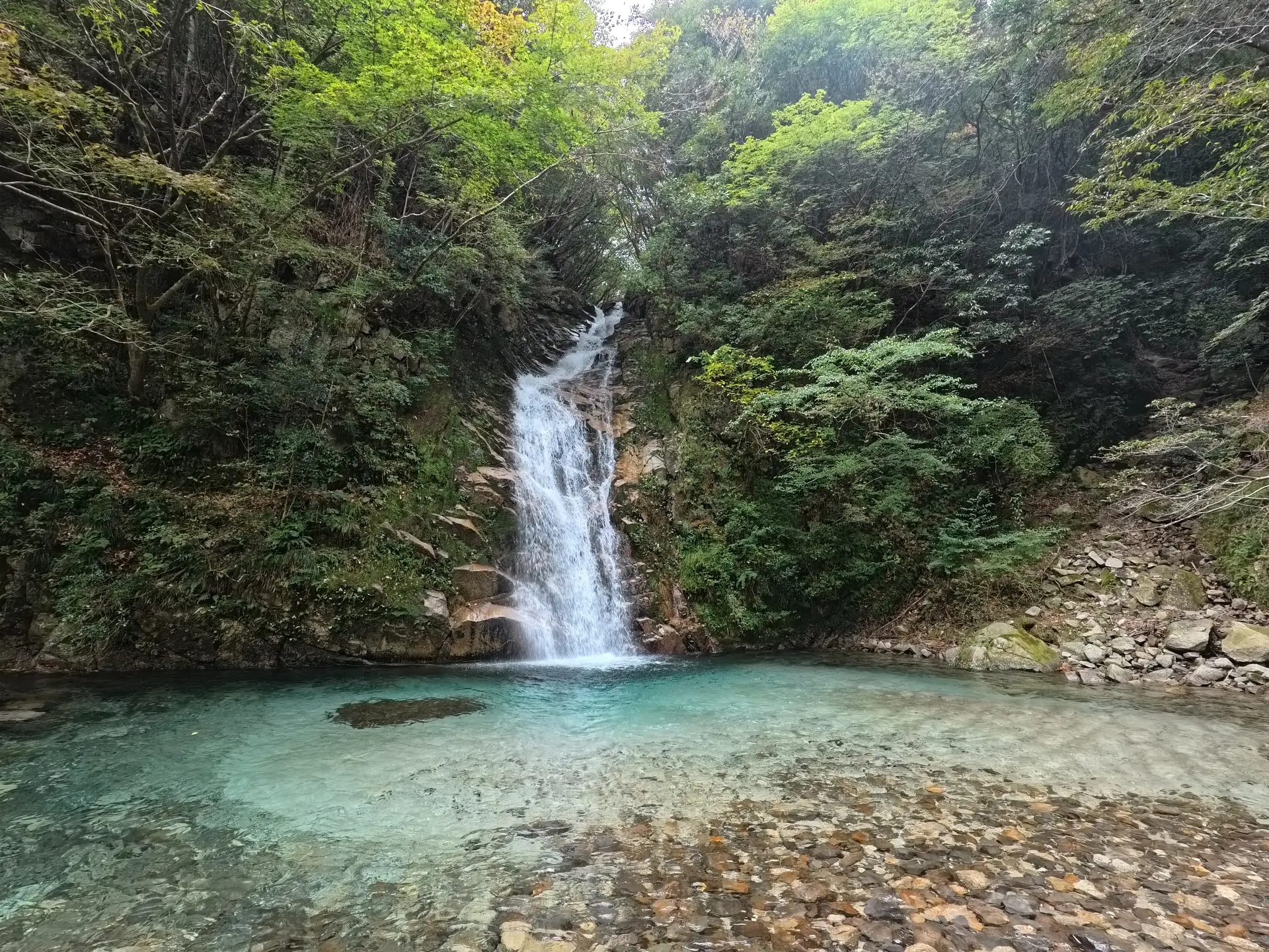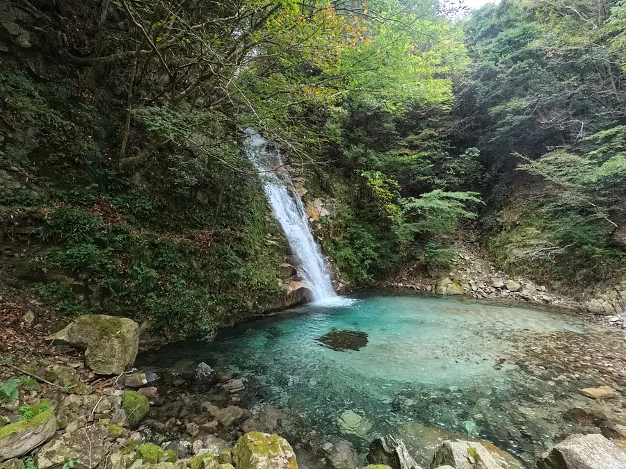宇賀渓の最深部にある滝です。滝壺の青色がとても美しく、秘境感を感じる滝です。