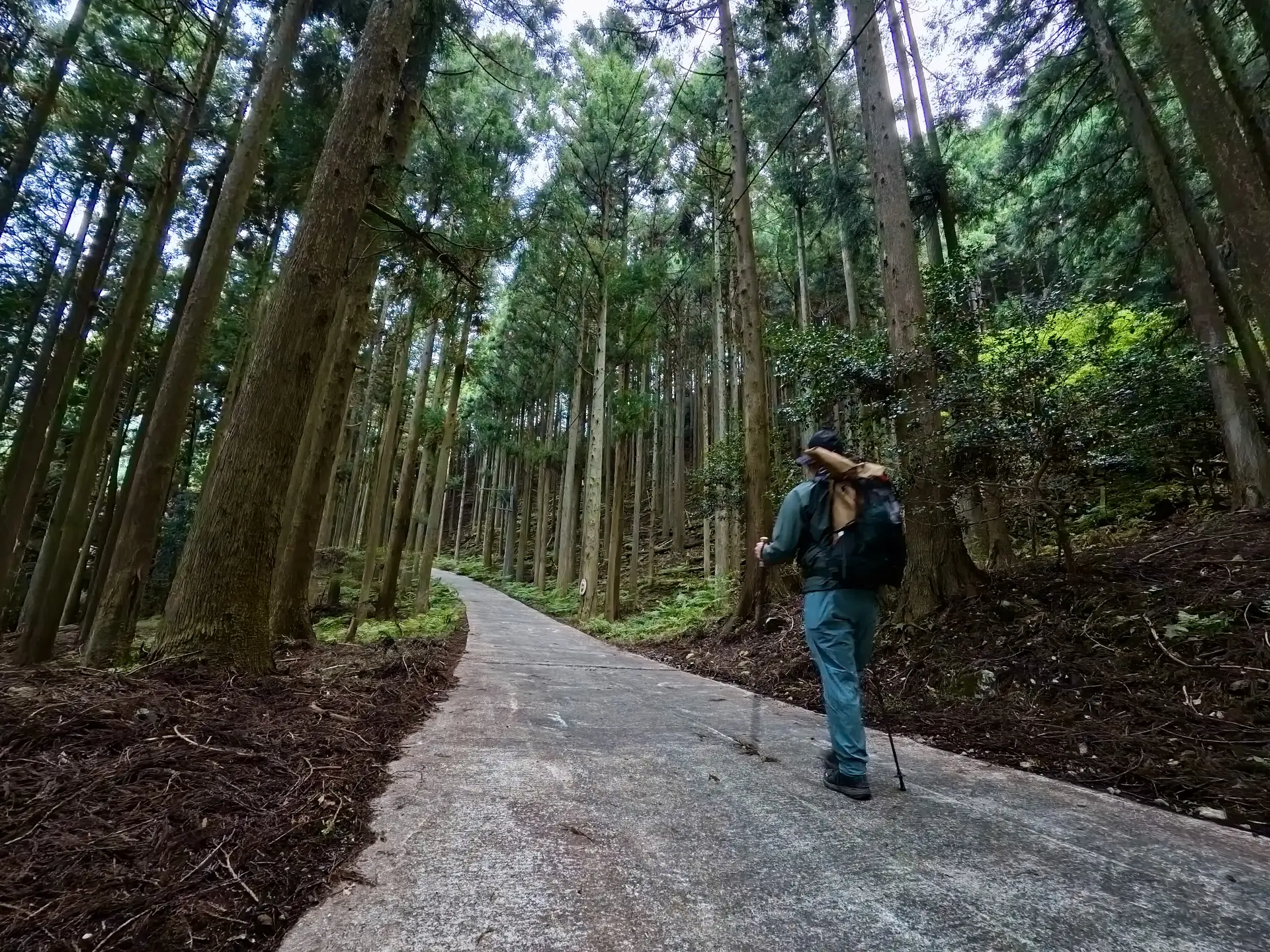 スタートからしばらくは、舗装された林道を歩きます。木に囲まれた林道を森林浴を楽しみながら歩きましょう。