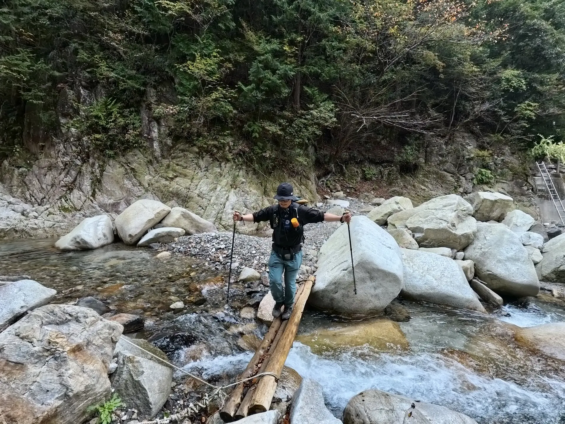 スタートから約20分、宇賀川に到着します。川辺に行く手前にはしごがあります。ゆっくりと慎重に降りましょう。