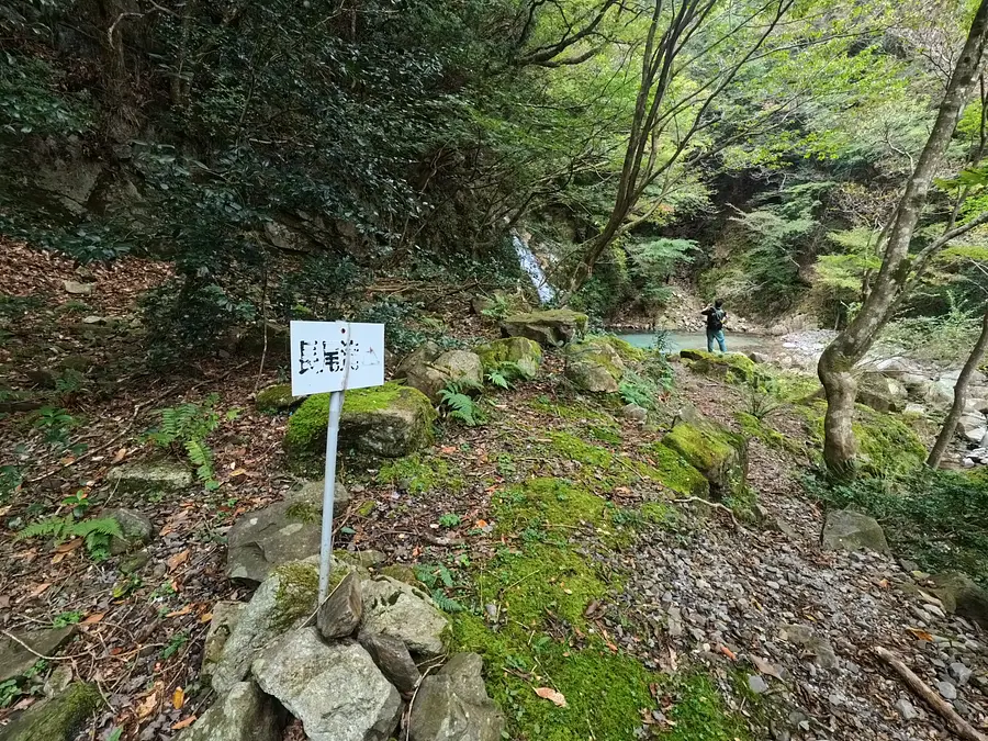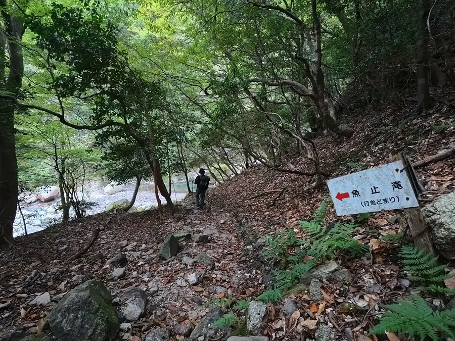 魚止橋を渡って道なりに進むと、魚止滝の看板があるので、看板の矢印の方向へ下っていきます。