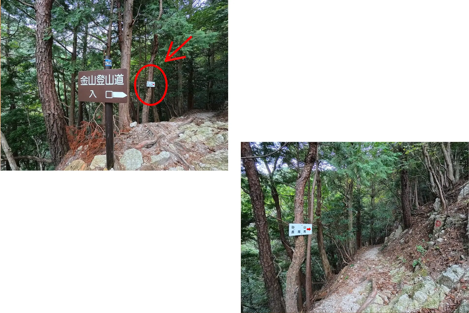 約10分ほど歩くと、金山登山道入口に着きますが、曲がらずにまっすぐ「砂山 長尾滝」の看板の矢印の方向に進みます。